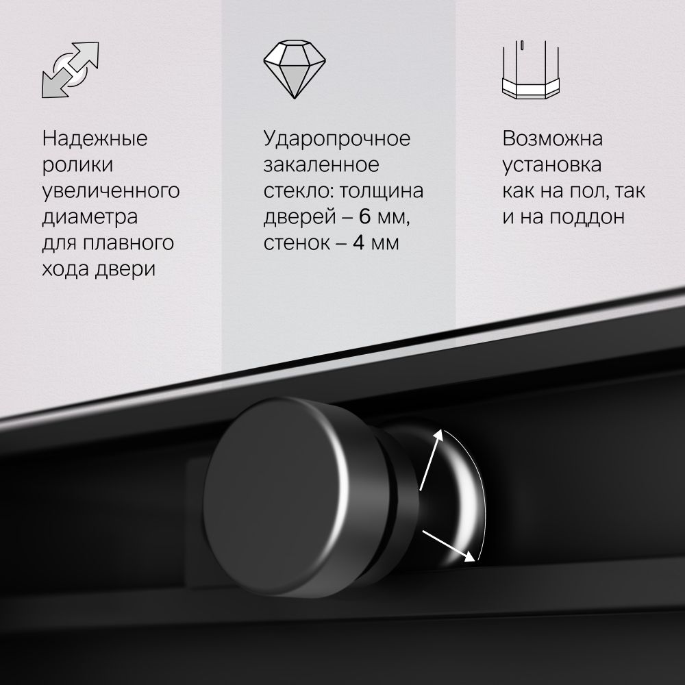 Прочная конструкция с надежными роликами увеличенного диаметра для плавного хода двери и закаленным стеклом. Толщина дверей – 6 мм. стенок – 4 мм. Беспрецедентно стойкое покрытие: надежный алюминиевый профиль окрашен методом порошкового нанесения при высокой температуре благодаря чему краска ложится на профиль идеально ровно а также проникает в структуру самого металла.