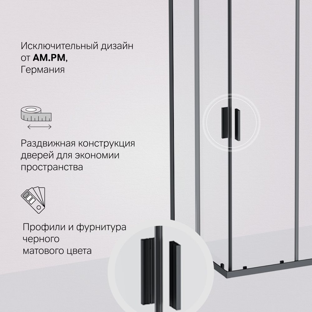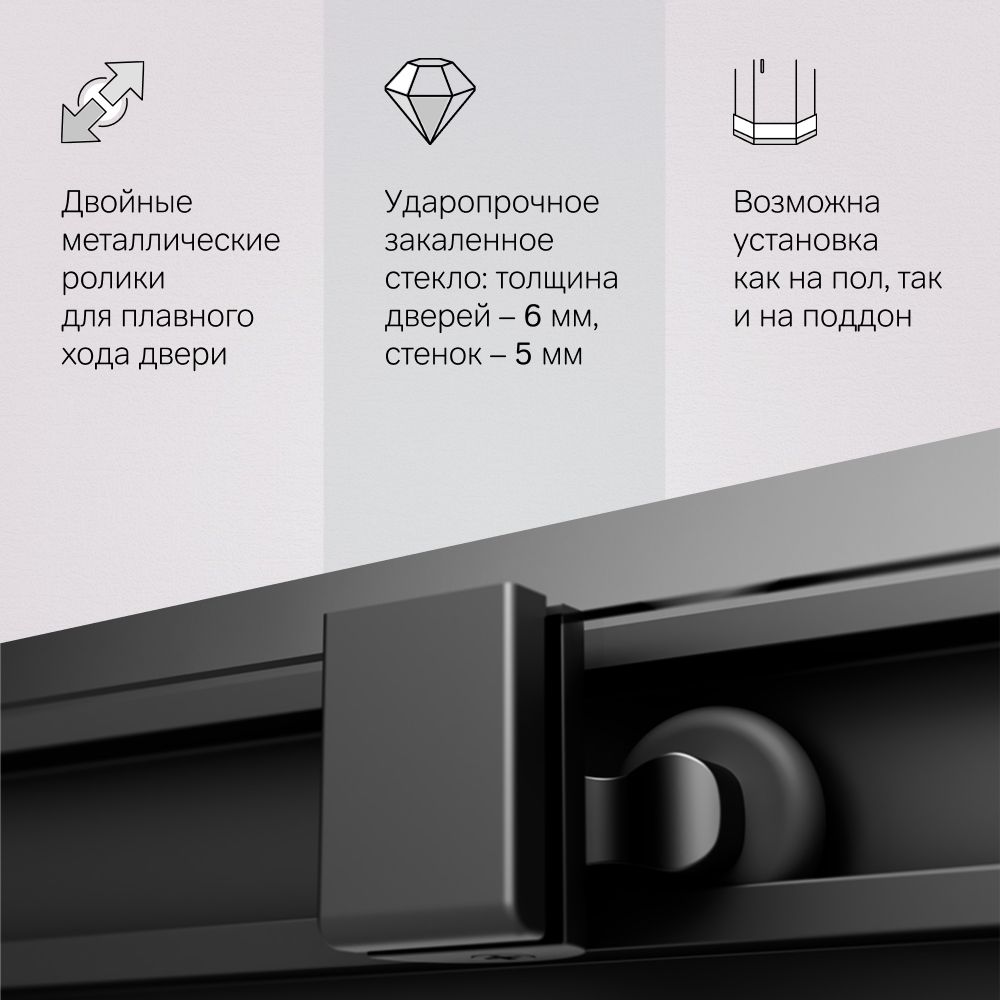Душевое ограждение выполнено из ударопрочного закаленного стекла. Толщина фиксированного стекла 5 мм толщина стекла двери 6 мм. Профили ограждения изготовлены из надежного алюминия с премиальным анодированным покрытием. Анодирование обеспечивает равномерный насыщенный цвет и особенную стойкость к механическим повреждениям. ""