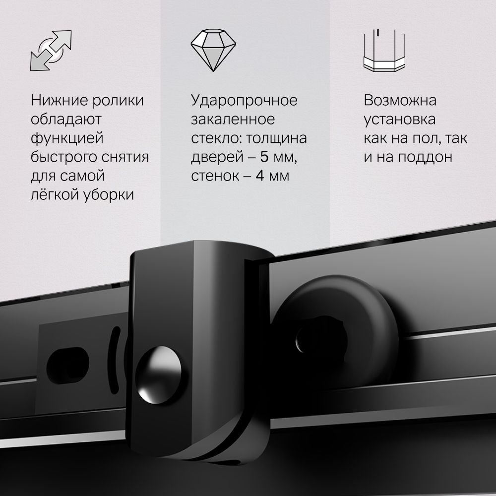 Ограждение имеет сверхпрочные закаленные стёкла. Толщина фиксированных стекол составляет 4 мм двери имеют увеличенную толщину 5 мм. Невероятно плавное и легкое открывание двери благодаря двойным усиленным роликам из ABS-пластика. Нижние ролики обладают функцией быстрого снятия для самой лёгкой уборки. Магнитные уплотнители дверей делают ограждение полностью герметичным и предотвращают попадание воды за пределы душевой зоны.
