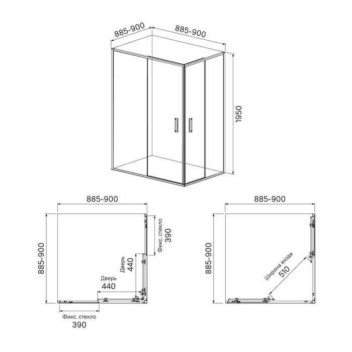 Свойства. Длина изделия, мм: 900; Высота изделия, мм: 1950; Ширина изделия, мм: 900; Гарантийный срок: 2 года; Уникальные преимущества: Современный дизайн, покрытие Easyclean, легкая уборка и уход(съемные двери); Цвет полотна двери: Прозрачный; Материал профиля: Алюминий; Материал полотна двери: Закаленное стекло; Наличие функции easy clean: Да; Форма (конфигурация): Квадратная; Тип установки (расположение): Угловое; Характеристика фурнитуры дверей (петли, ролики): Ролики из нержавеющей стали; Толщина полотна двери (мм): 6; Страна производитель: Россия; Дополнительный материал: Алюминий; Тип упаковки: Картонная коробка; Конструкция дверей: Раздвижные; Стиль: Модерн.