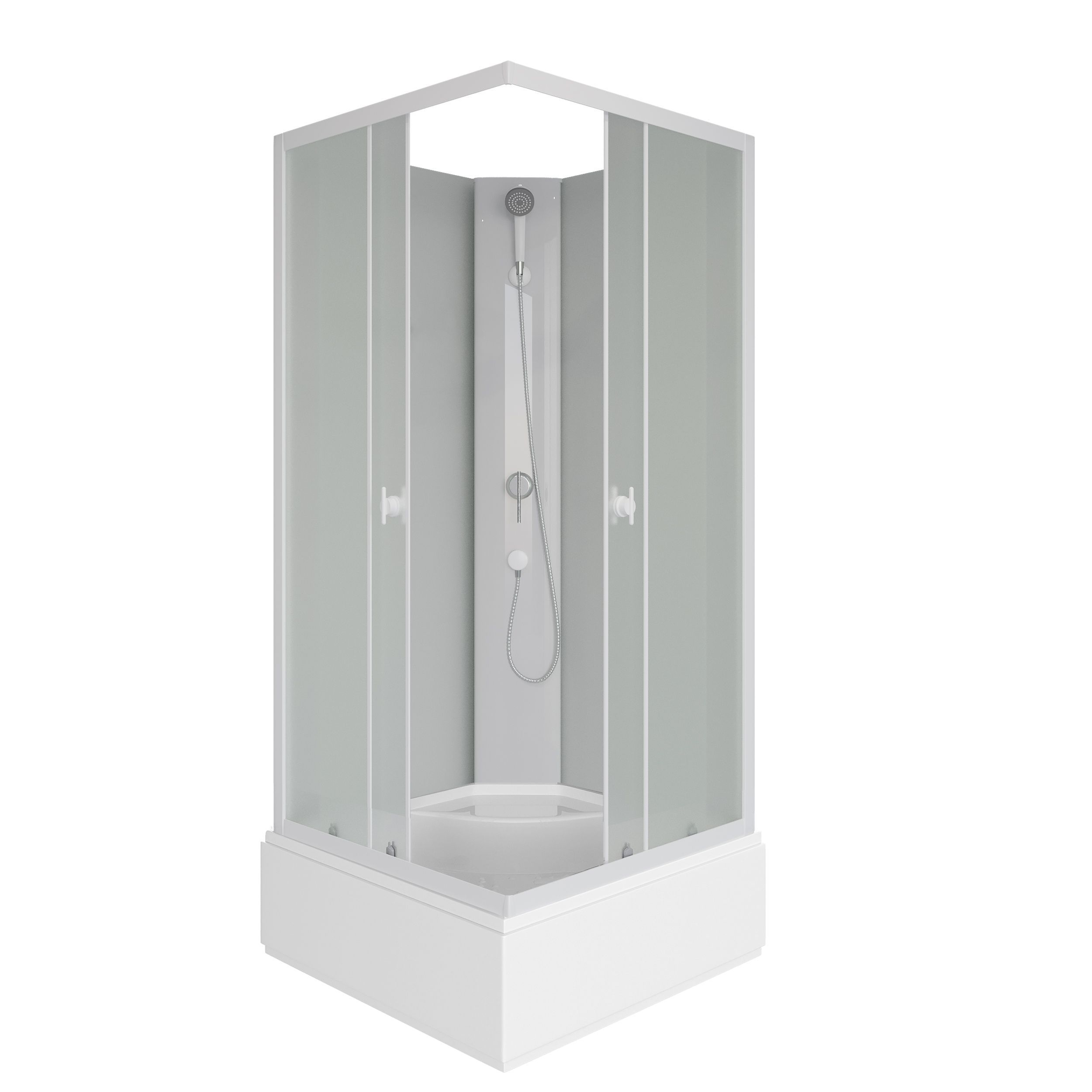 Стекла душевой кабины Promo имеют матовую поверхность. Двери раздвижные с одинарными роликами.