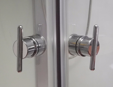 Размер:900х900х2150 мм. Высота поддона 15 см. Глубина поддона 5 см. Задняя стенка белая. Передние стекла матовые. Толщина стекла 4мм. Профиль хромированный. Душевая лейка. Верхний душ (тропический ливень). Полочка для ванных принадлежностей.