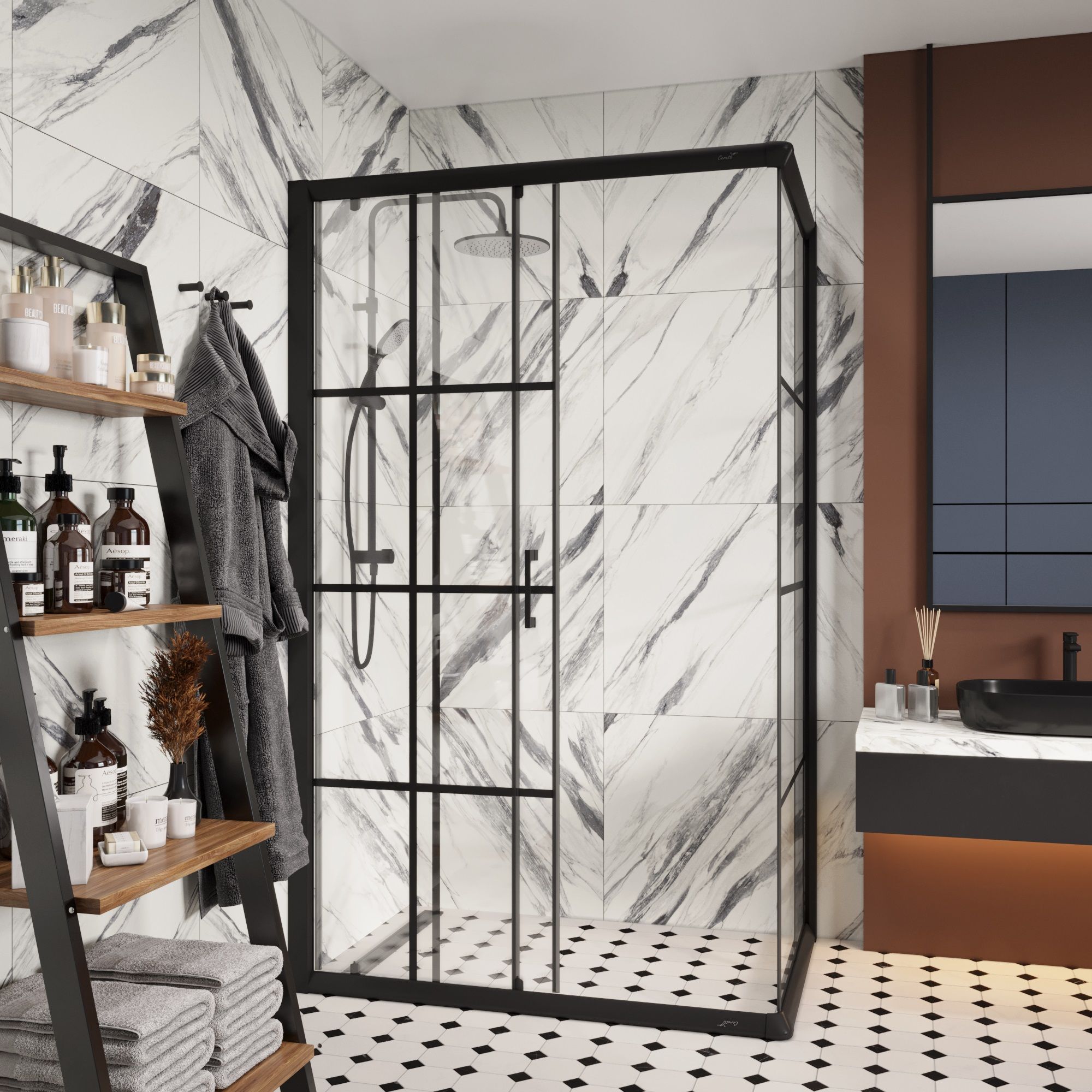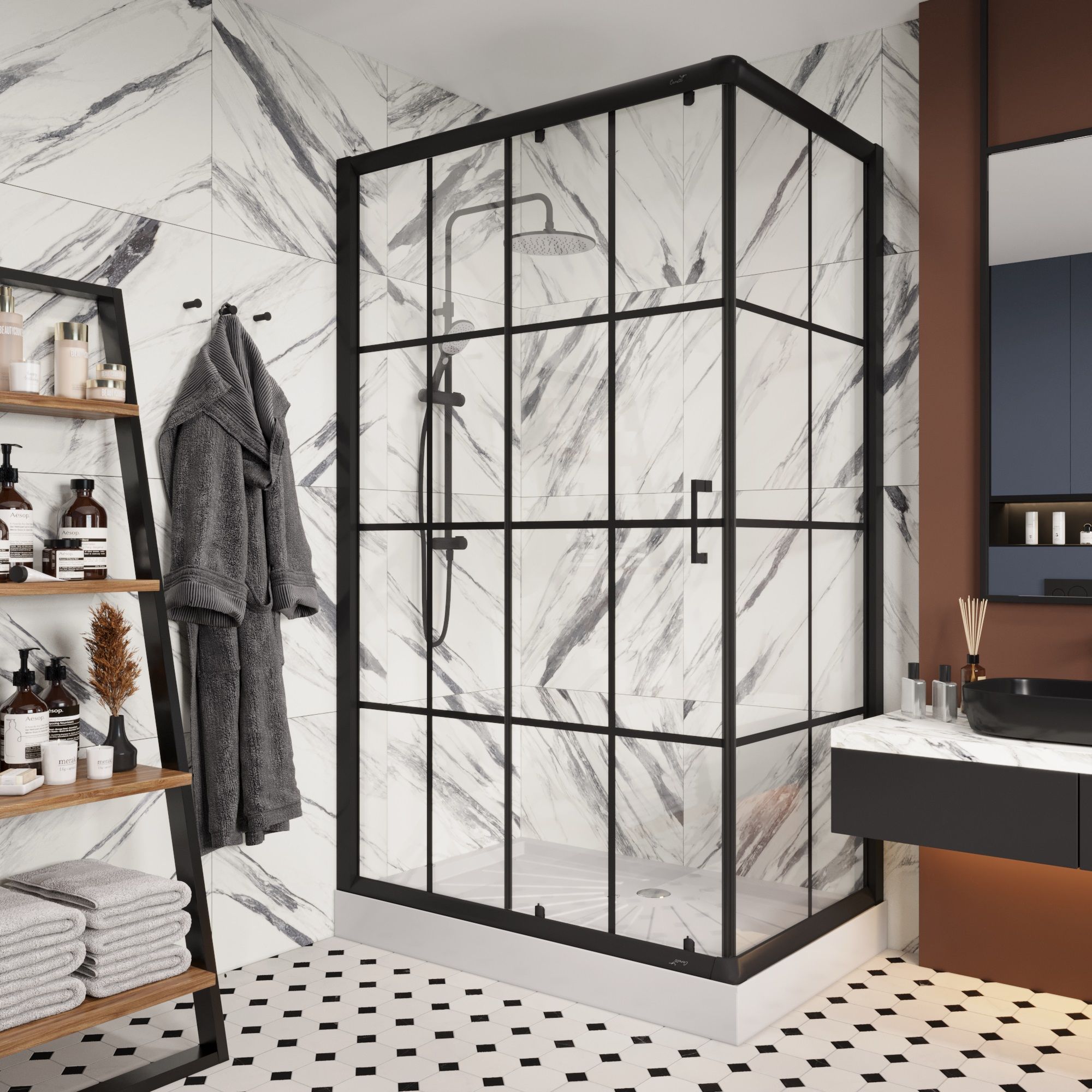 Модель из прозрачного стекла с черным принтом лаконично впишется в современный дизайн ванной комнаты. Внутри уголок достаточно просторный.