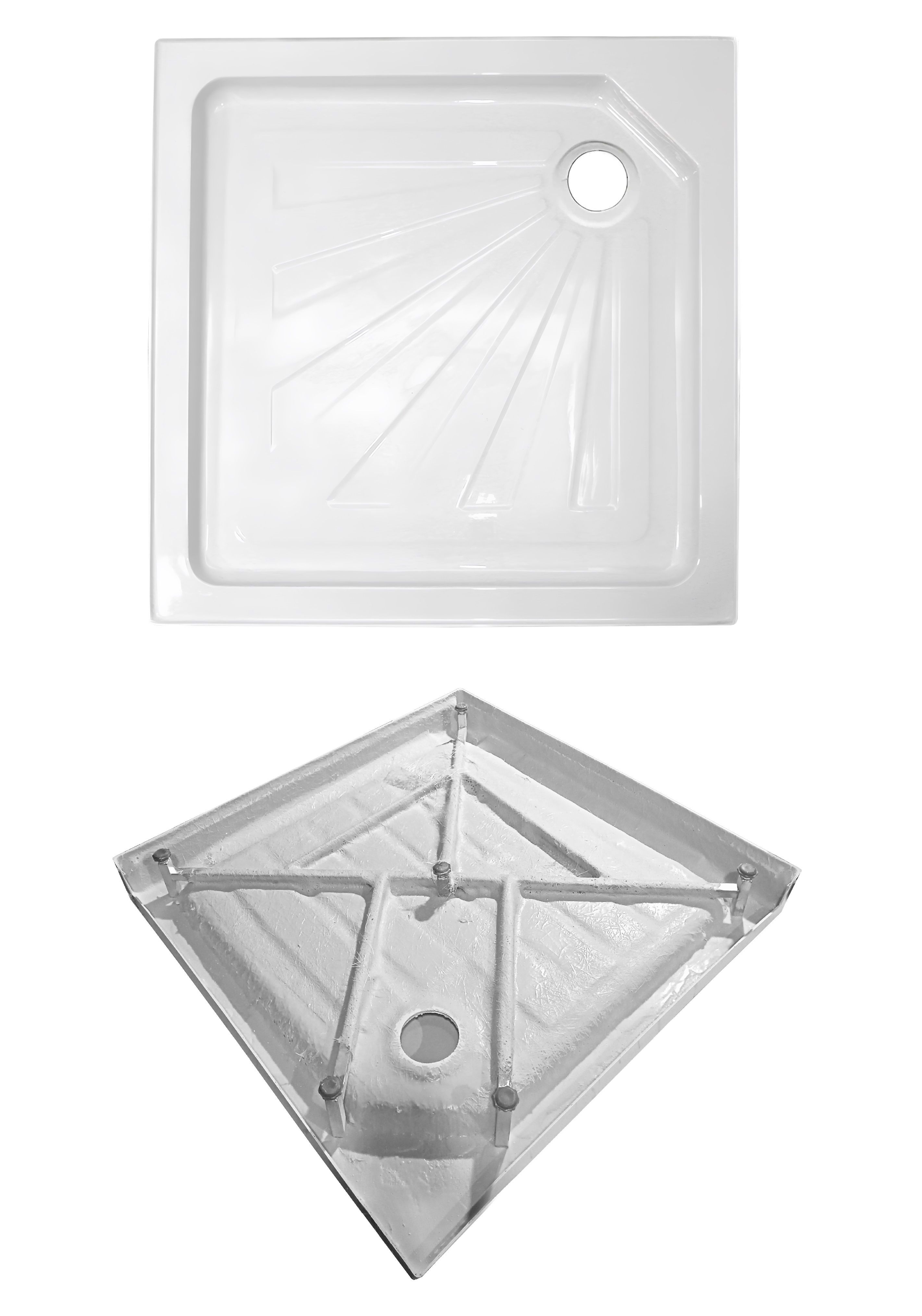 Прочности поддону придает армирующий слой, состоящий из эпоксидной смолы и стекловолокна, нанесенных в несколько слоев. Дно дополнительно имеет закладные из ДСП, толщиной 16мм. Такие поддоны способны выдержать нагрузку до 180 кг распределенной массы.
