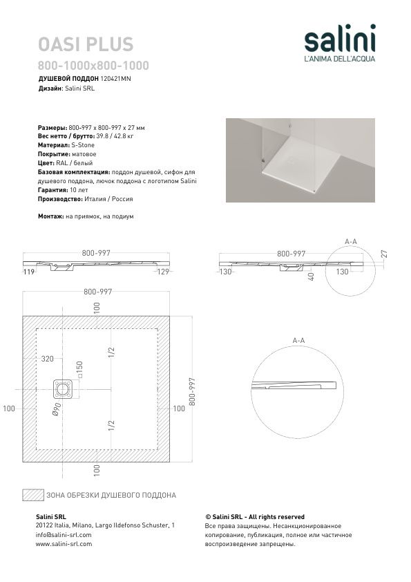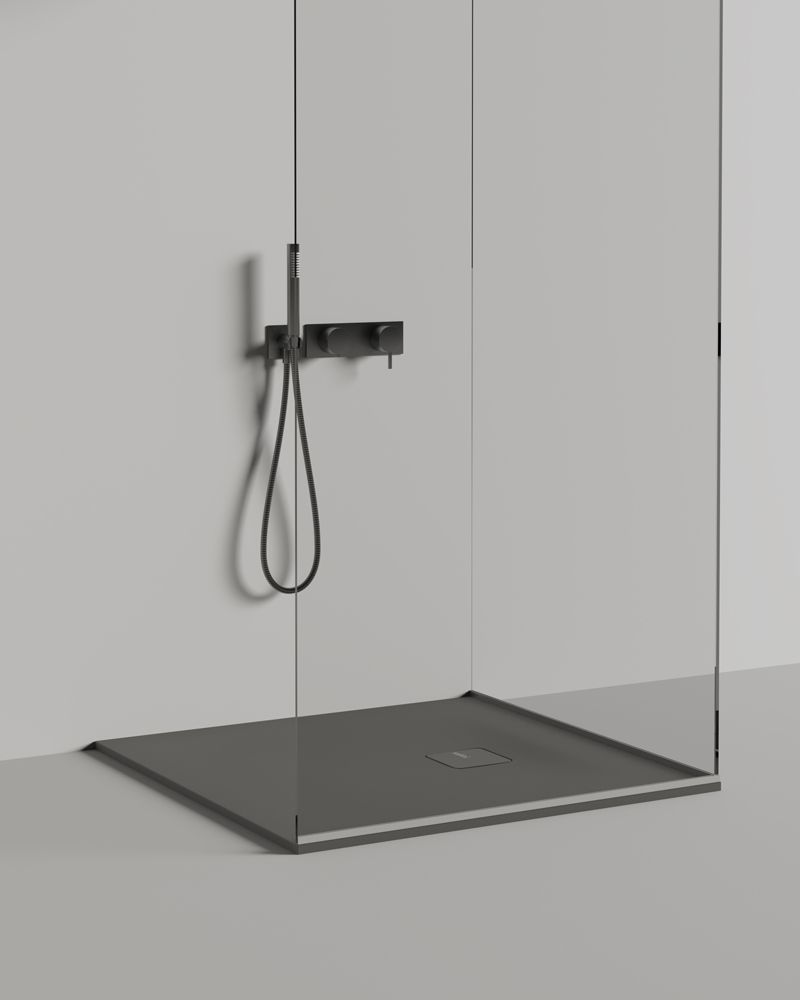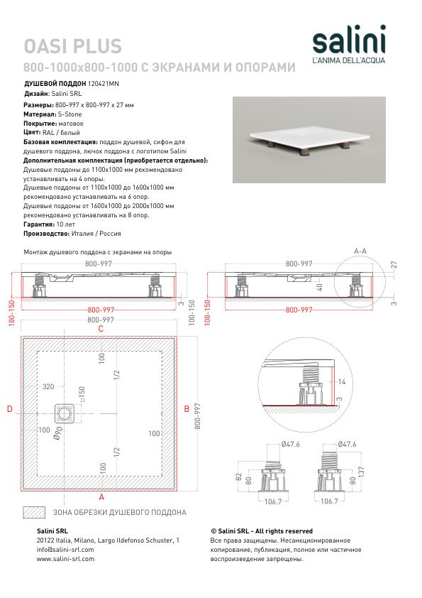 При монтаже на опоры возможно изготовление цельнолитых экранов для душевого поддона из того же материала в оттенках палитры Salini RAL Classic. Такая монолитная конструкция дарит восприятие стильного и элегантного подиума. По желанию цвет экранов может не совпадать с основным оттенком поддона.