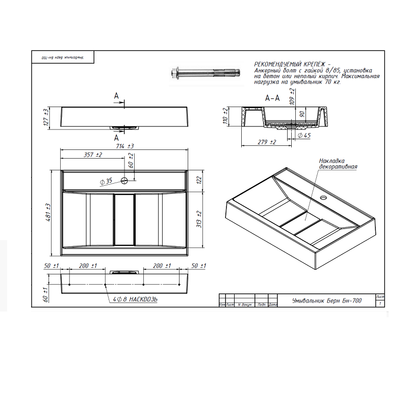 Расположение отверстия под смеситель: по центру;