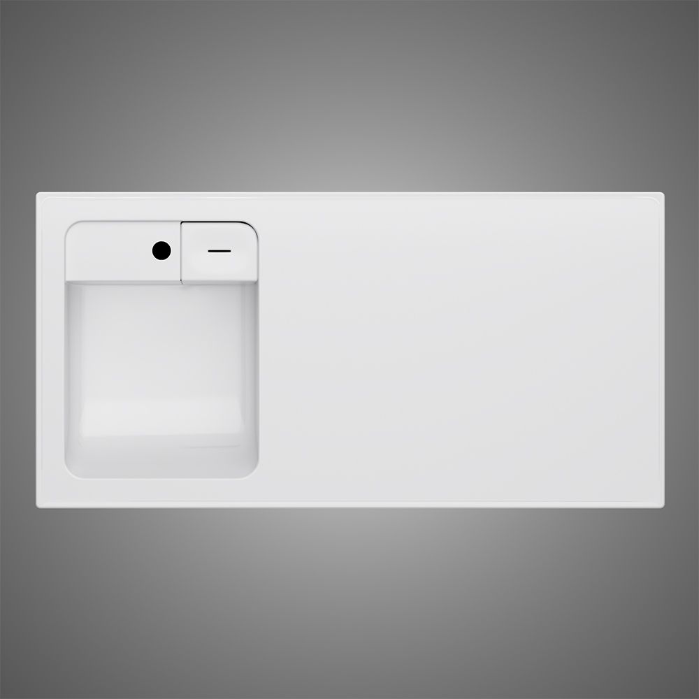 Дизайнерская раковина из литьевого мрамора белоснежного цвета с бортиком скрытым сливом и съемной мыльницей. Раковина оснащена просторной столешницей на которой можно разместить косметические и гигиенические средства. Столешница защищает стиральную машину от повреждений и механических воздействий.