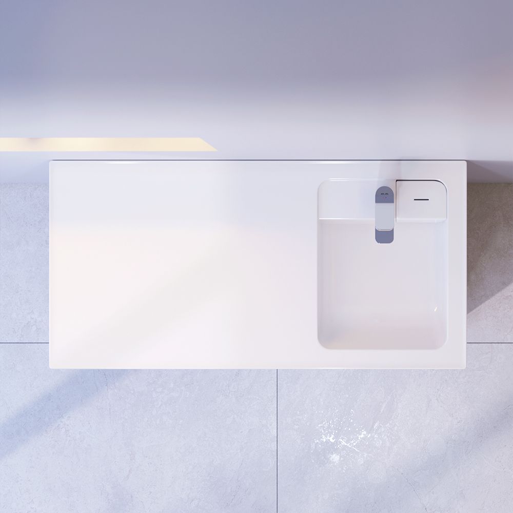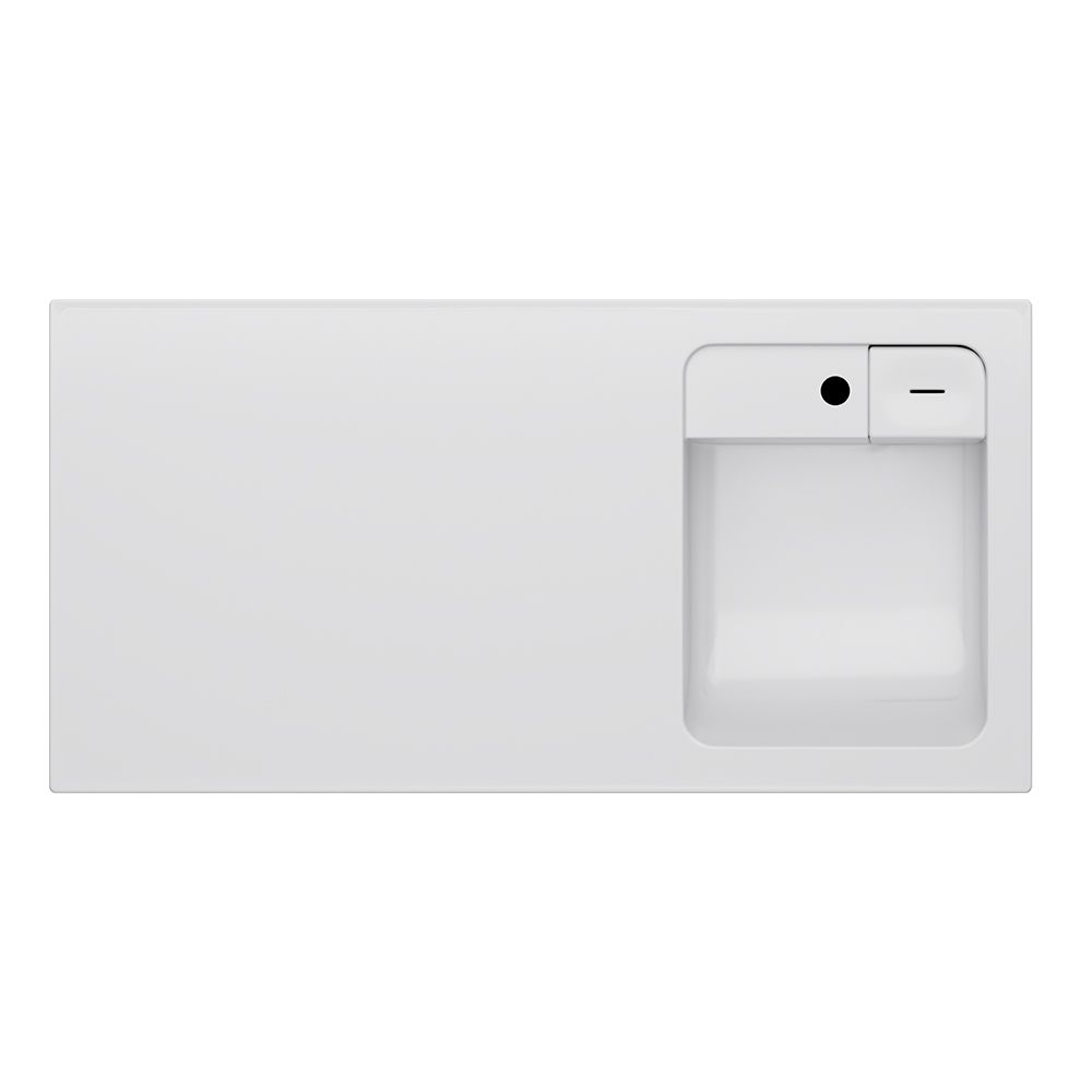 Дизайнерская раковина из литьевого мрамора белоснежного цвета с бортиком скрытым сливом и съемной мыльницей. Раковина оснащена просторной столешницей на которой можно разместить косметические и гигиенические средства. Столешница защищает стиральную машину от повреждений и механических воздействий.