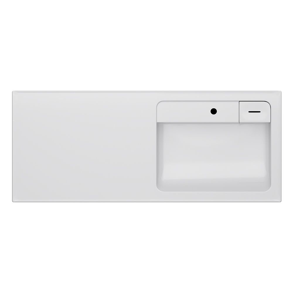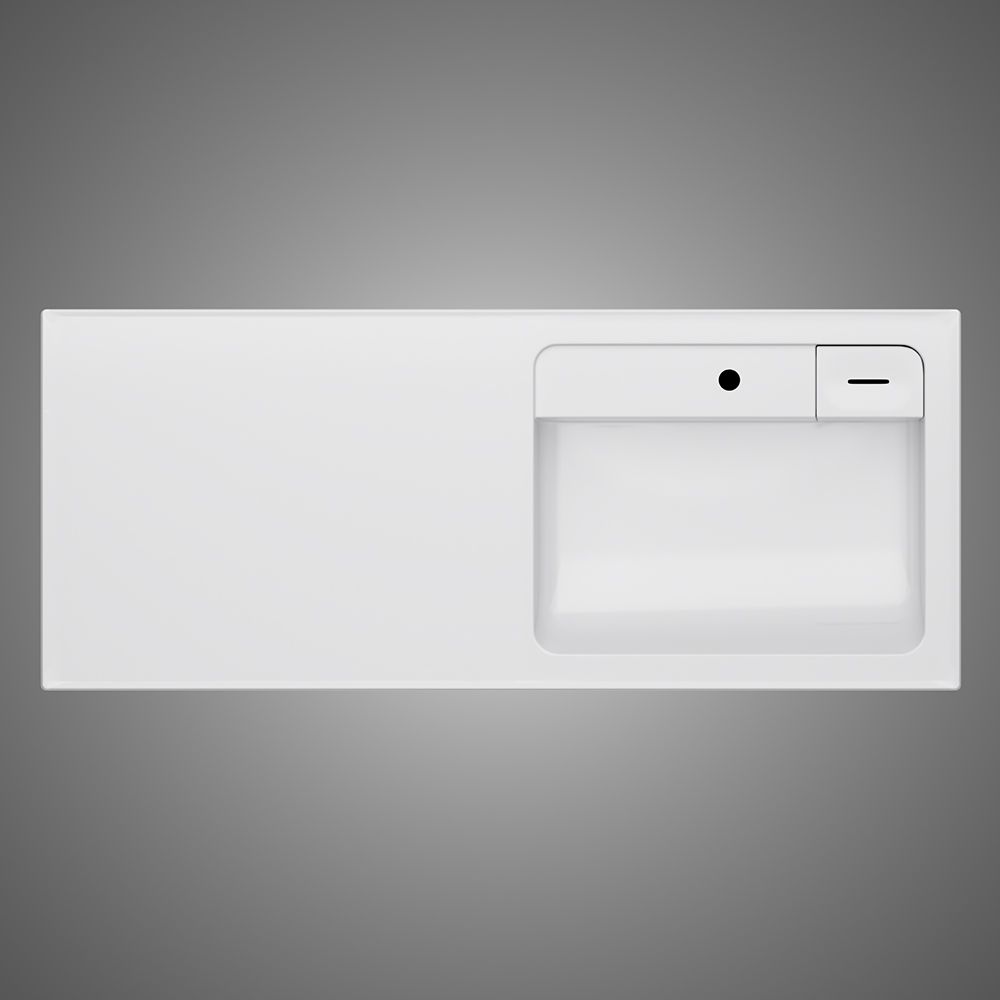 Дизайнерская раковина из литьевого мрамора белоснежного цвета с бортиком скрытым сливом и съемной мыльницей. Раковина оснащена просторной столешницей на которой можно разместить косметические и гигиенические средства. Столешница защищает стиральную машину от повреждений и механических воздействий.