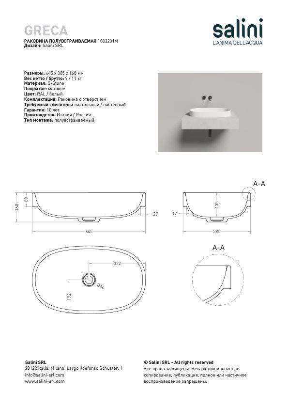 Модель предназначена для настольного монтажа. Раковины GRECA доступны в любых цветах, входящих в палитру Salini RAL Classic.