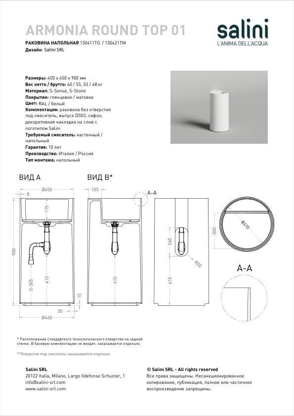 ARMONIA — это выбор не только в пользу красоты, но и функциональности: конструкция чаши спроектирована таким образом, чтобы вся вода оставалась внутри неё, исключая попадание брызг за пределы раковины. И напольные, и накладные модели выглядят одинаково стильно, не заставляя искать компромиссы. Сливное отверстие закрывается изящной декоративной накладкой с логотипом Salini.