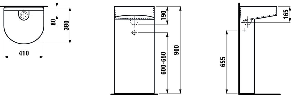 Свойства. Изделие: Раковина (напольная); Группа товара: Раковины для ванной комнаты; Монтаж: Напольный; Тип монтажа: Пристенный; Материал: Санфаянс (санитарная керамика); Вес изделия: 25 кг; Форма: Овальная; Ширина: 410 мм; Высота: 900 мм; Глубина: 380 мм; Особенности: Без отверстий под смеситель..
