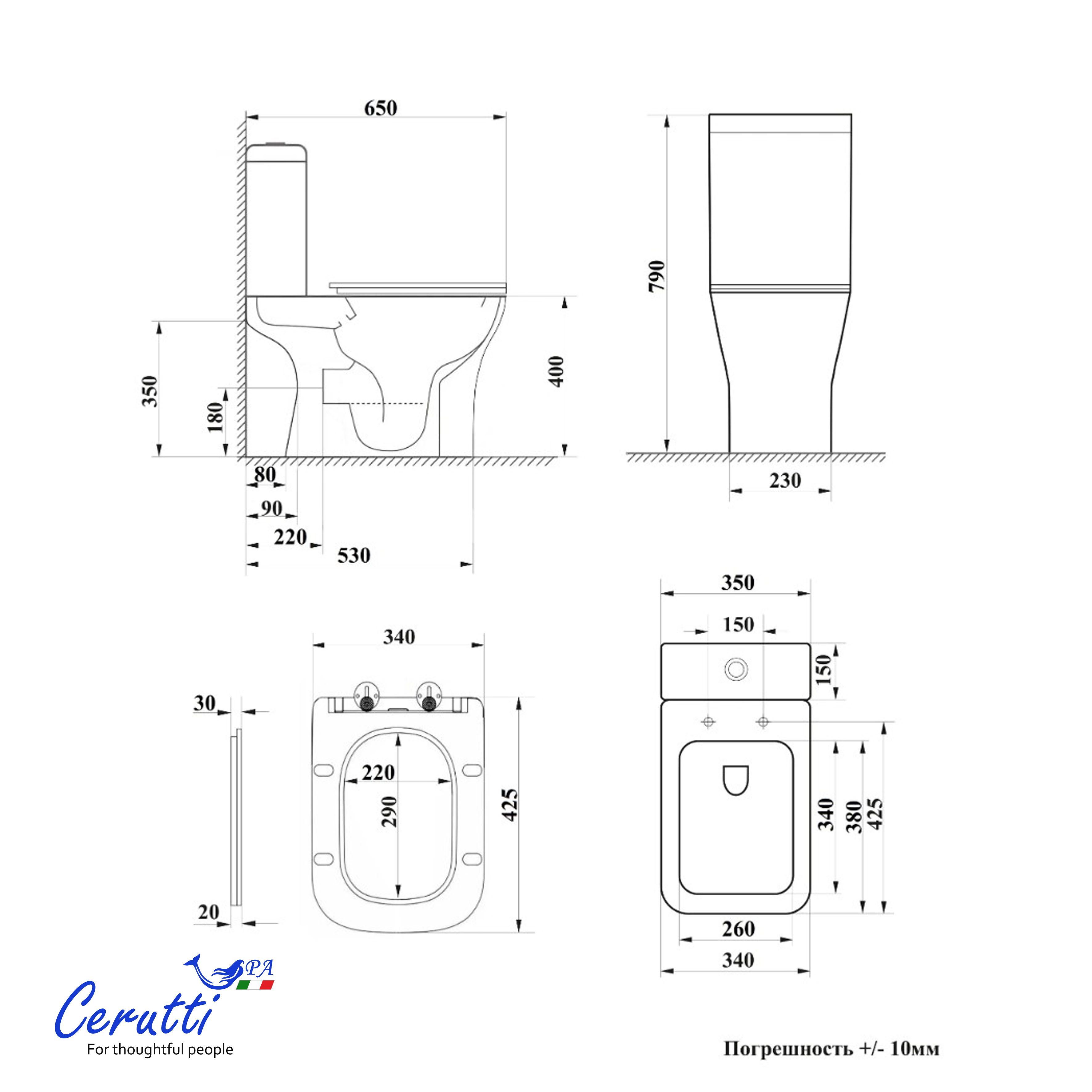 Габариты: 650×340×790 мм. Унитаз надёжно крепится к полу, гарантируя устойчивость конструкции.