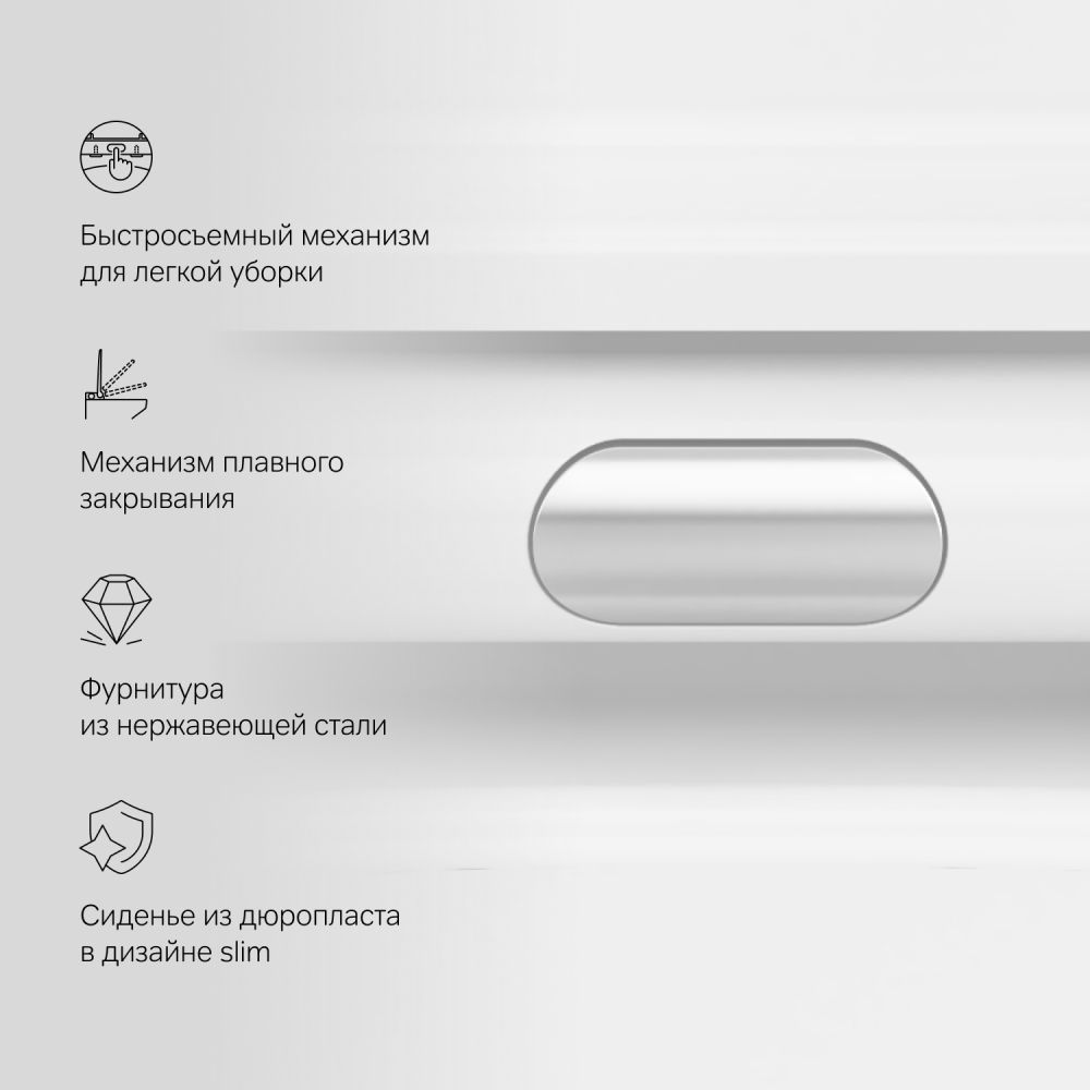 Комплектуется быстросъемным сиденьем из дюропласта с механизмом плавного закрывания. Материал сиденья дюропласт устойчивый к появлению царапин в сочетании с креплениями из нержавеющей стали гарантируют долговечность сиденья.