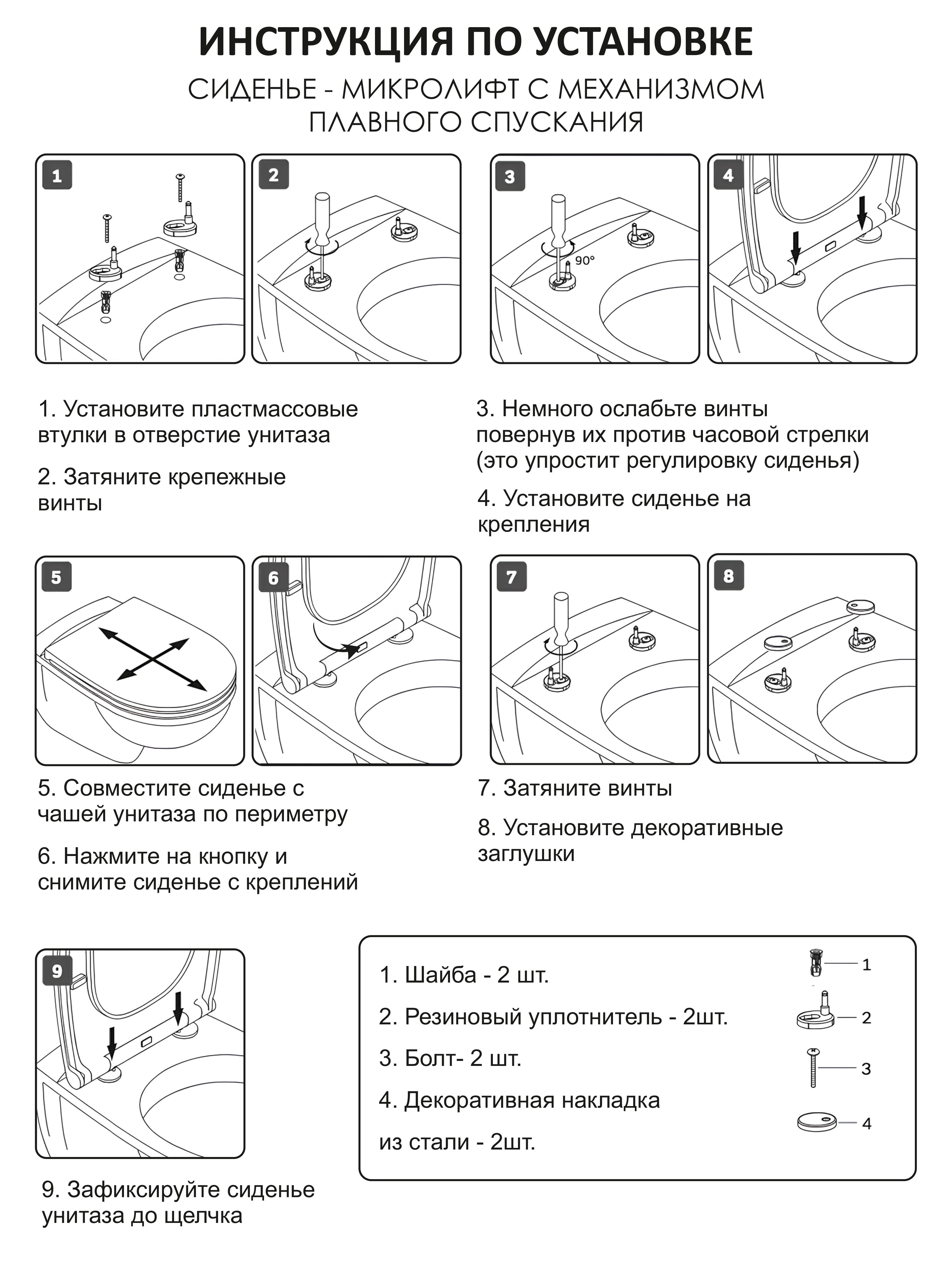 В комплекте присутствует легкосъемное сидение с крышкой, оснащенное системой микролифт (для плавного и бесшумного опускания). Снятие осуществляется одним нажатием кнопки.