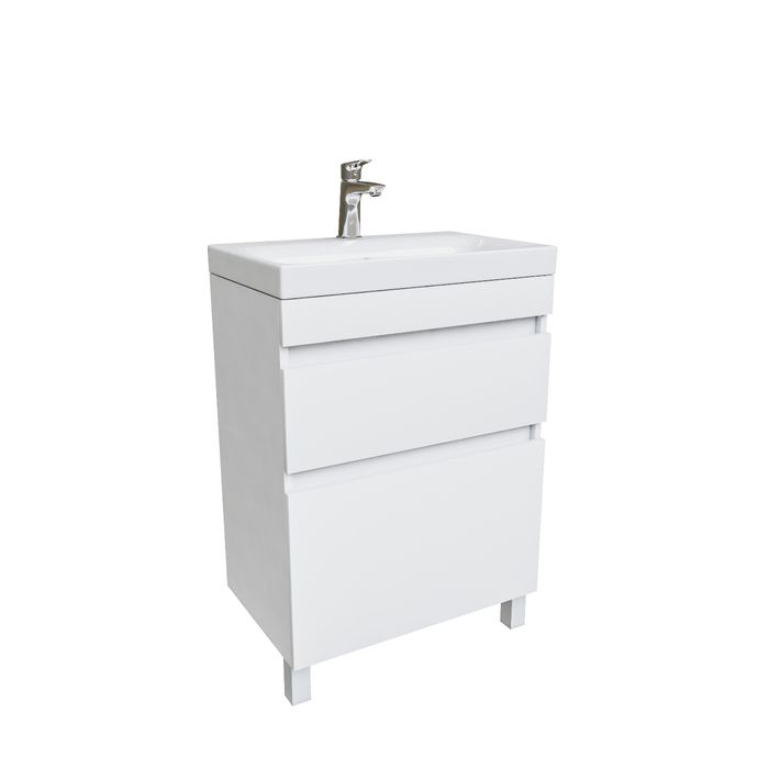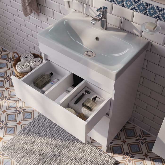 • В комплекте также белые пластиковые ножки высотой 100 мм и сифон, за счет чего тумба полностью готова к установке.