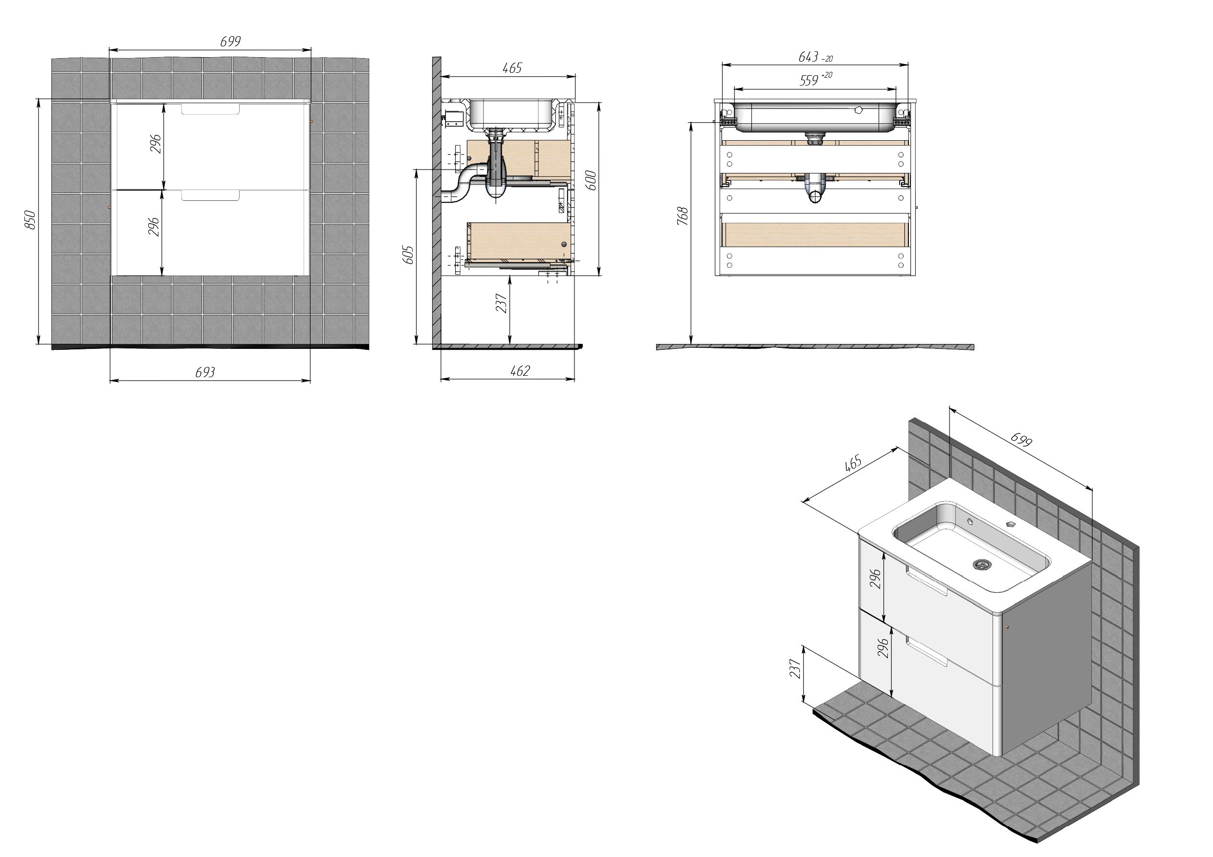 Тумба подвесная BRIZ Прато 70 с умывальником Прато, 240 03-18070-16 00 БЕЛ