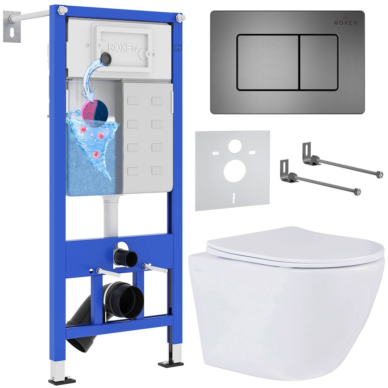 - инсталляция для подвесного унитаза Roxen StounFix Dual Fresh 710200; - подвесной унитаз Roxen Antares 530185-01; - комплект удлиненных креплений; - звукоизолирующая панель; - кнока для инсталляции Roxen Steel 420280G. |