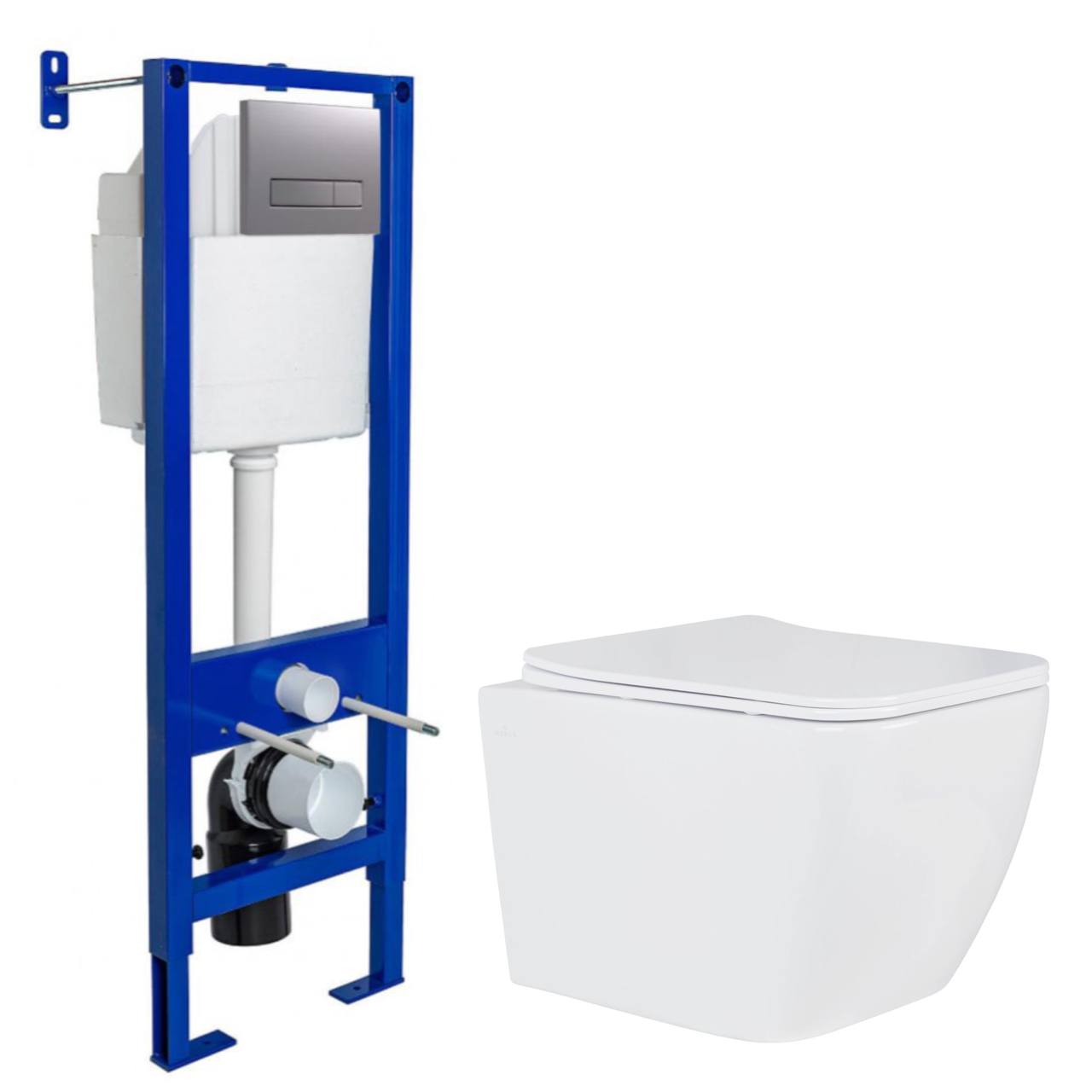 Комплект инсталляций Berges Аtom Line 410 с хром матовой кнопкой и подвесной безободковый унитаз Roxen Cube 530135-01 Rimless Soft Close