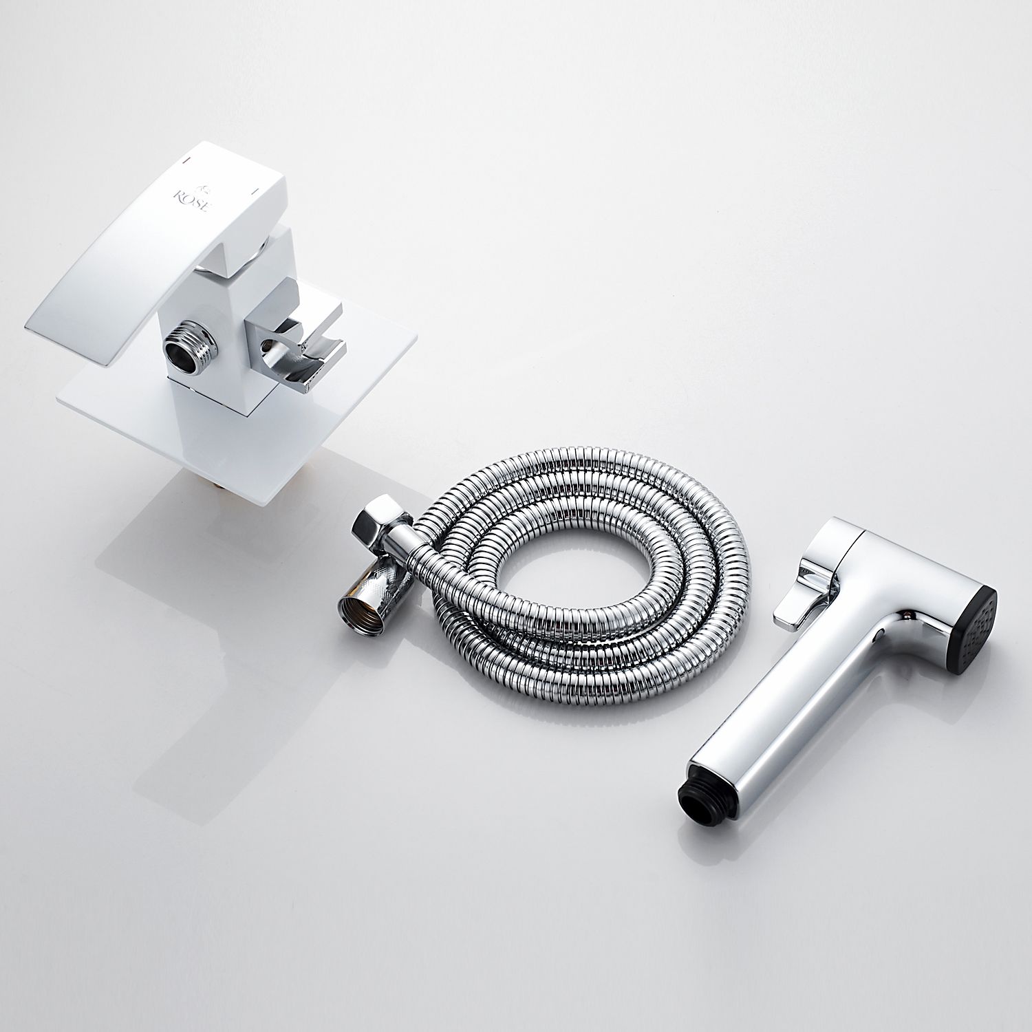 - Комплектация: гигиеническая лейка, держатель лейки, душевой шланг, наружная часть смесителя, смеситель