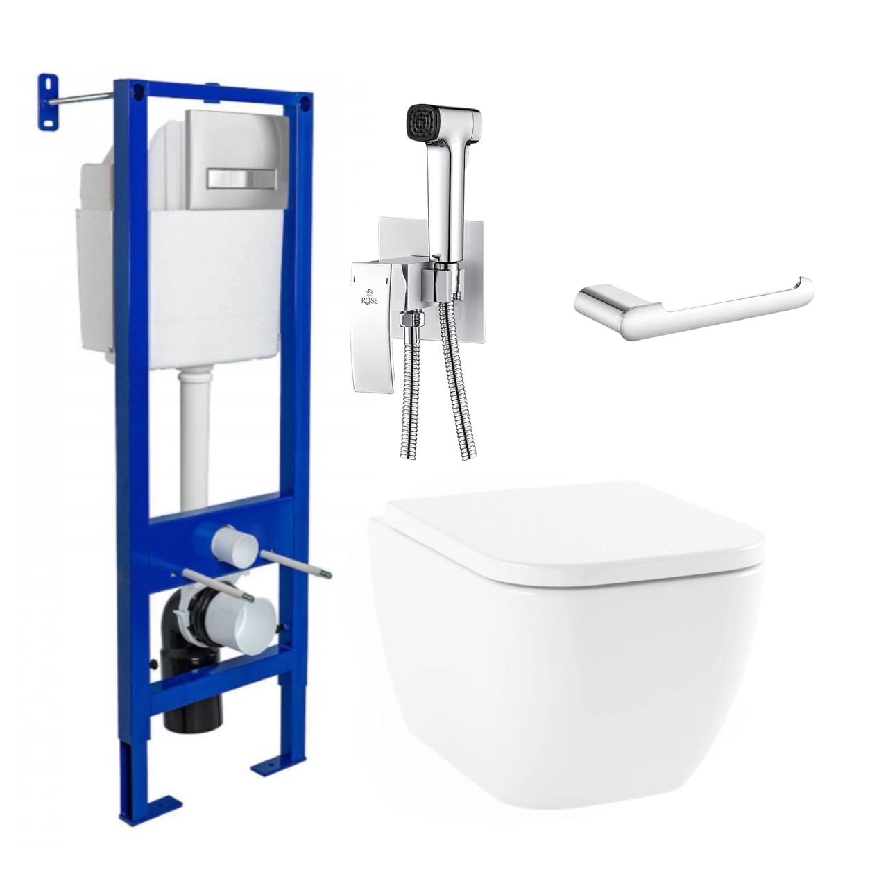 Комплект инсталляции Berges Аtom Line 410 с хромированной кнопкой, унитаз Lavinia Boho One Rimless 3302004R с крышкой, смеситель с гигиеническим душем Rose R1505F-2 и держатель для туалетной бумаги Rose RG1705, хром