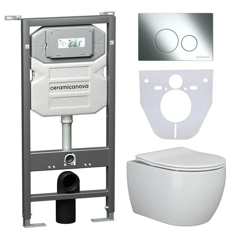 Сет 4 в 1: Подвесной унитаз PLAY Rimless арт. CN3001 + Шумоизоляционная панель для инсталляции арт. CN1000 + Система инсталляции для унитазов CERAMICANOVA Envision с кнопкой смыва Round цвет хром и креплениями, арт. CN1001CH