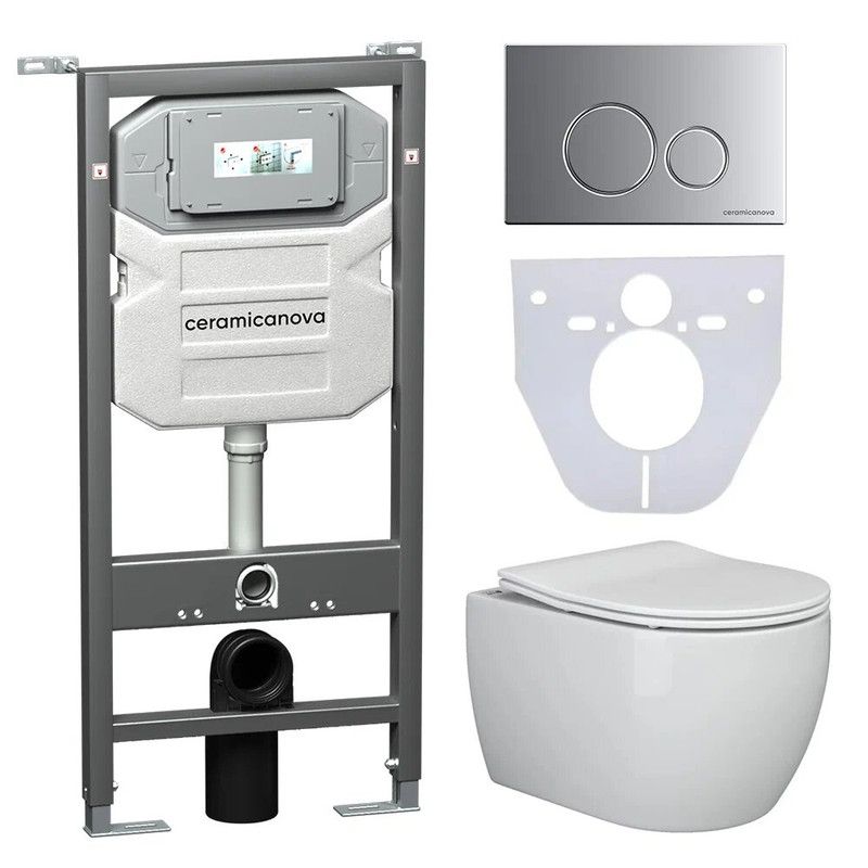 Сет 4 в 1: Подвесной унитаз PLAY Rimless арт. CN3001 + Шумоизоляционная панель для инсталляции арт. CN1000 + Система инсталляции для унитазов CERAMICANOVA Envision с кнопкой смыва Round цвет хром матовый и креплениями, арт. CN1001M
