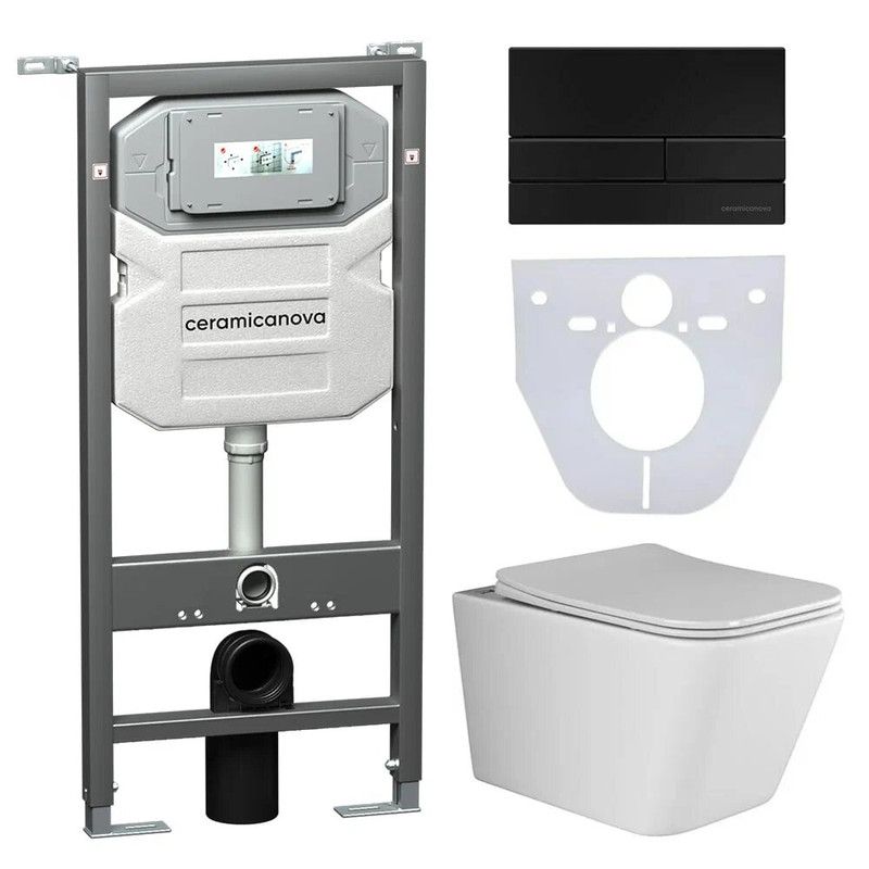 Сет 4 в 1: Подвесной унитаз Metric Rimless арт. CN3007 + Шумоизоляционная панель для инсталляции арт. CN1000 + Система инсталляции для унитазов CERAMICANOVA Envision с кнопкой смыва Flat цвет черный матовый, креплениями, арт. CN1002B