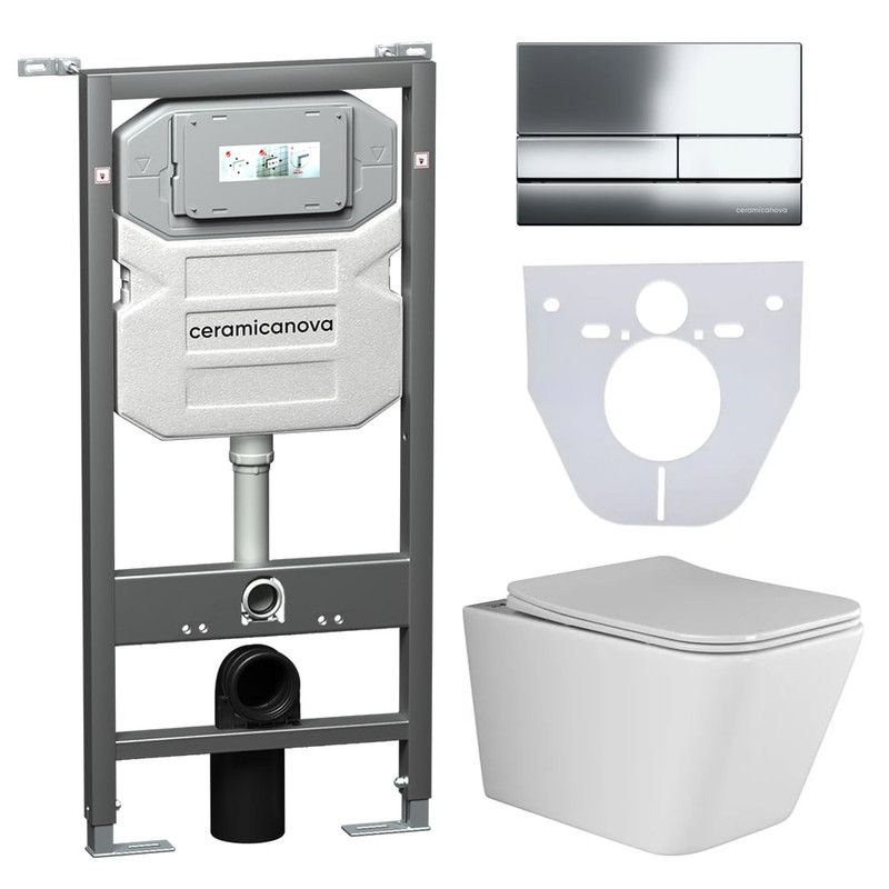 Сет 4 в 1: Подвесной унитаз Metric Rimless арт. CN3007 + Шумоизоляционная панель для инсталляции арт. CN1000 + Система инсталляции для унитазов CERAMICANOVA Envision с кнопкой смыва Flat цвет хром, креплениями, арт. CN1002CH