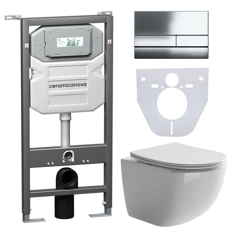 Сет 4 в 1: Подвесной унитаз Forma Rimless арт. CN3009 + Шумоизоляционная панель для инсталляции арт. CN1000 + Система инсталляции для унитазов CERAMICANOVA Envision с кнопкой смыва Flat цвет хром, креплениями, арт. CN1002CH