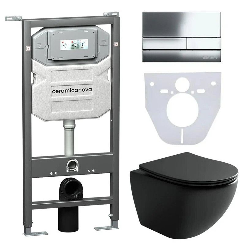 Сет 4 в 1: Подвесной унитаз Metropol Rimless арт. CN4002MB + Шумоизоляционная панель для инсталляции арт. CN1000 + Система инсталляции для унитазов CERAMICANOVA Envision с кнопкой смыва Round цвет хром и креплениями, арт. CN1001CH