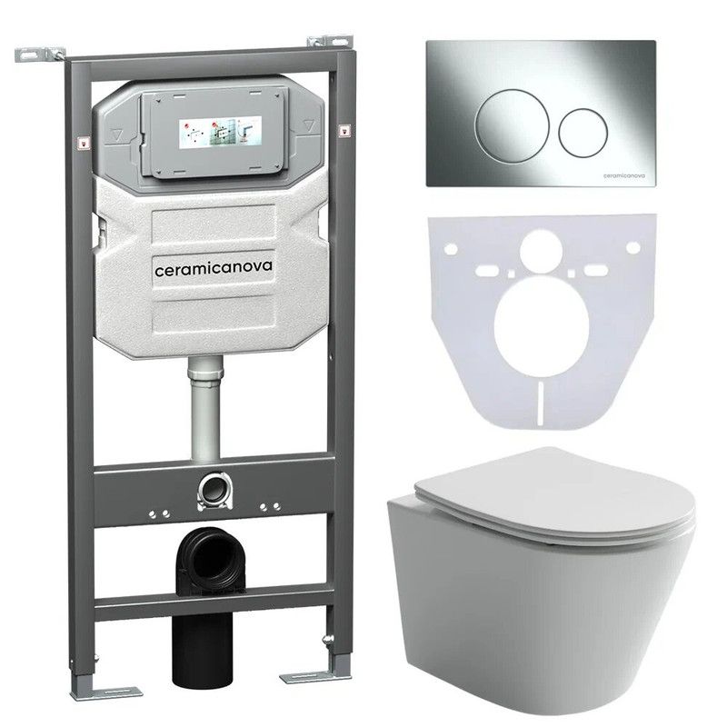 Сет 4 в 1: Подвесной унитаз Balearica Rimless арт. CN6000 + Шумоизоляционная панель для инсталляции арт. CN1000 + Система инсталляции для унитазов CERAMICANOVA Envision с кнопкой смыва Round цвет хром и креплениями, арт. CN1001CH