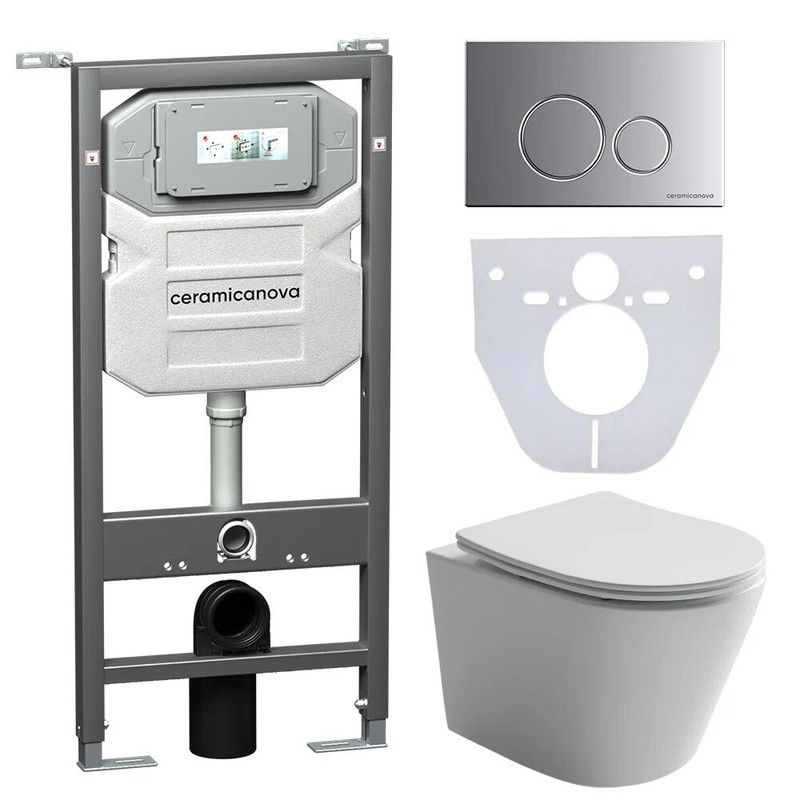Сет 4 в 1: Подвесной унитаз Balearica Rimless арт. CN6000 + Шумоизоляционная панель для инсталляции арт. CN1000 + Система инсталляции для унитазов CERAMICANOVA Envision с кнопкой смыва Round цвет хром матовый и креплениями, арт. CN1001M