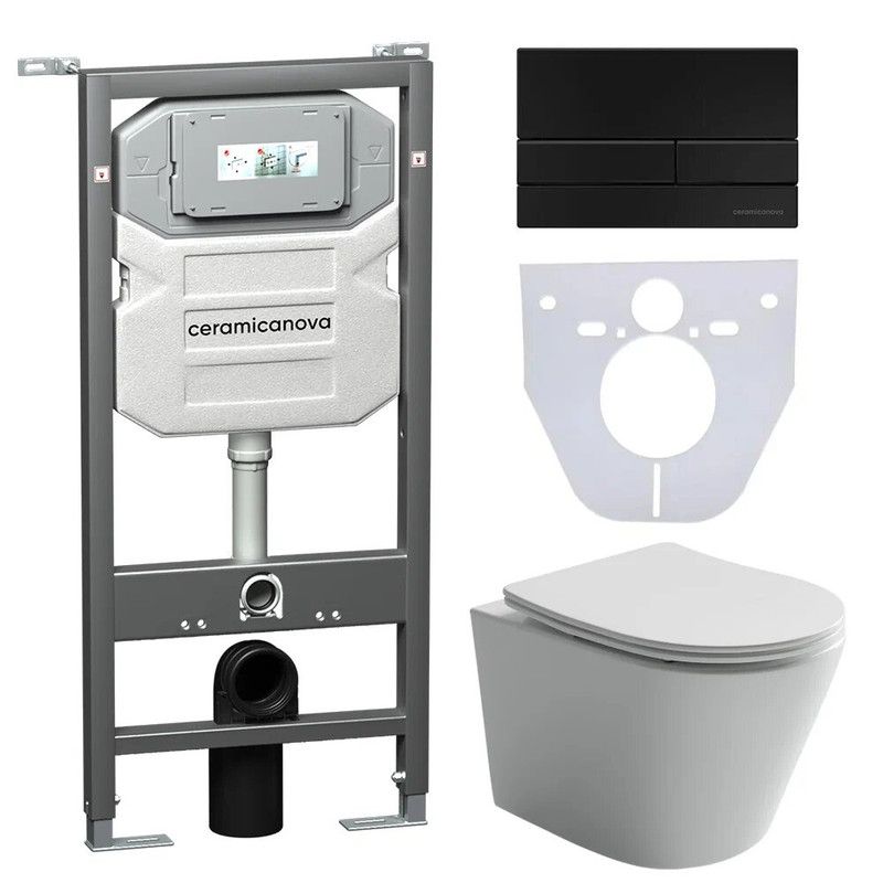 Сет 4 в 1: Подвесной унитаз Balearica Rimless арт. CN6000 + Шумоизоляционная панель для инсталляции арт. CN1000 + Система инсталляции для унитазов CERAMICANOVA Envision с кнопкой смыва Flat цвет черный матовый, креплениями, арт. CN1002B