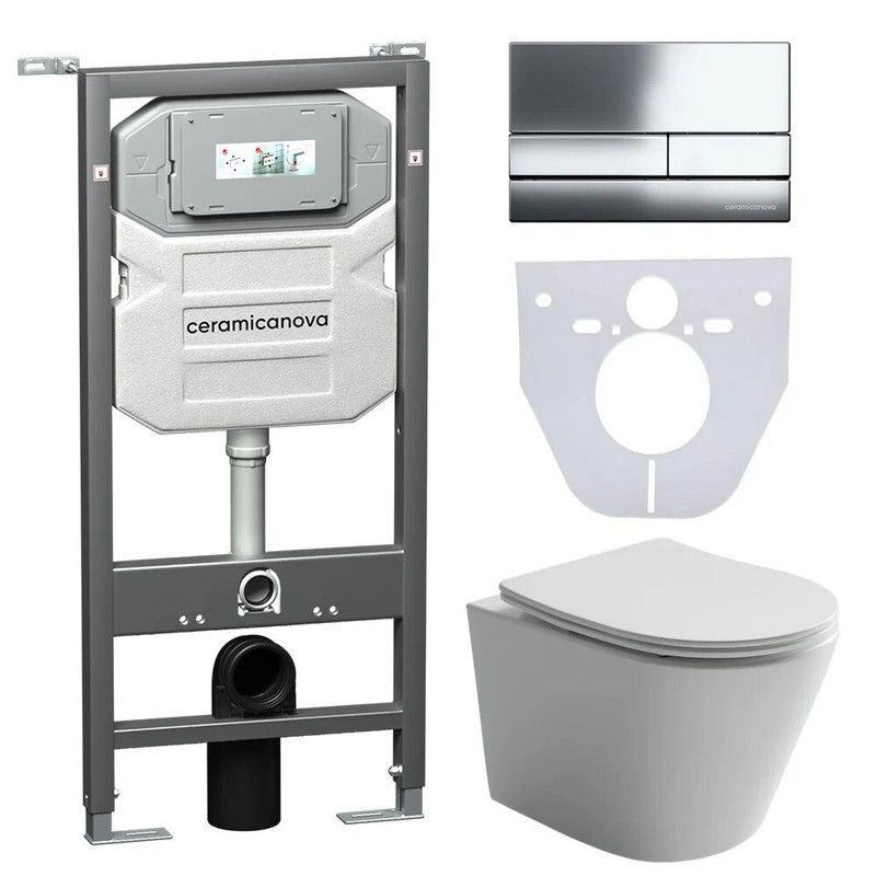 Сет 4 в 1: Подвесной унитаз Balearica Rimless арт. CN6000 + Шумоизоляционная панель для инсталляции арт. CN1000 + Система инсталляции для унитазов CERAMICANOVA Envision с кнопкой смыва Flat цвет хром, креплениями, арт. CN1002CH