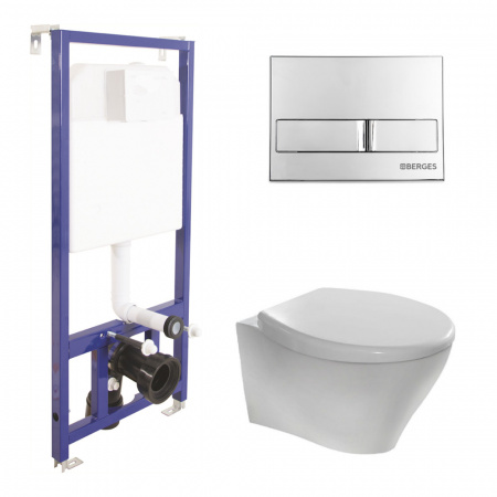 Комплект BERGES для монтажа подвесного унитаза: инсталляция NOVUM525, кнопка L3 хром глянец, унитаз TOP Rimless, сидение дюропласт Mita SO, микролифт, быстросьем