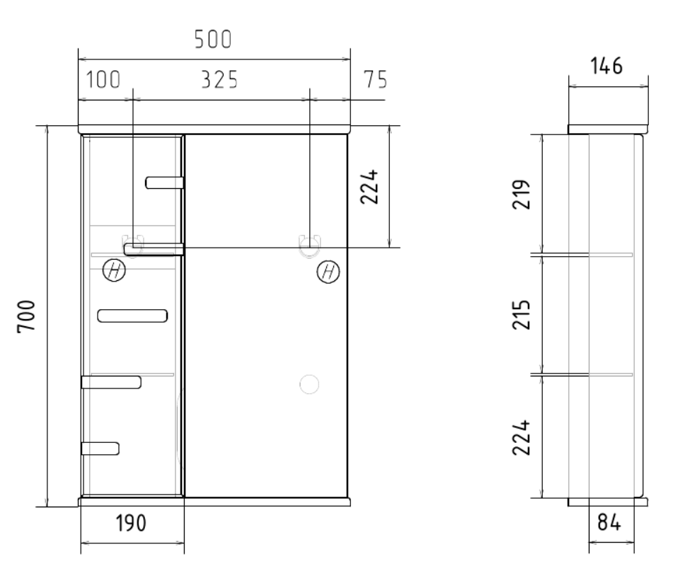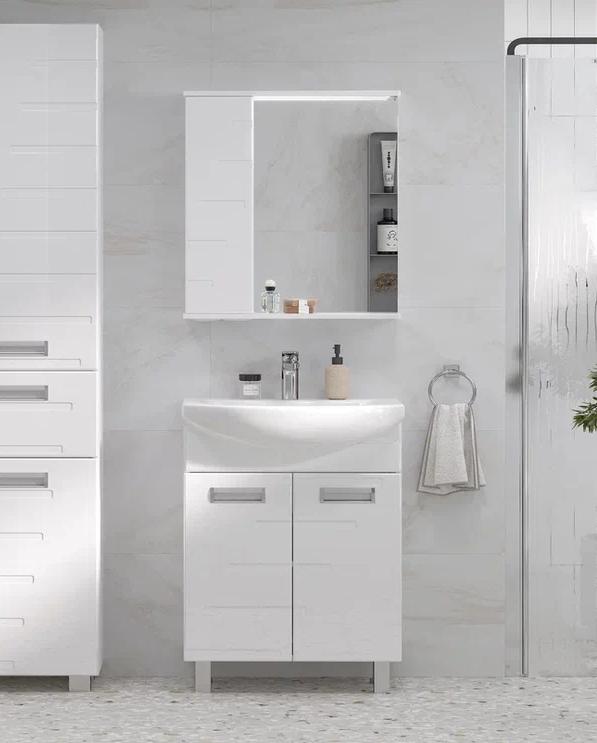 Зеркало-шкаф с двумя стеклянными полками за распашной дверцей. Петли оснащены доводчиками. Фасад зеркального шкафа изготовлена из МДФ и облицована глянцевой пленкой ПВХ. Зеркало-шкаф оснащено встроенной светодиодной подсветкой, электрической розеткой и выключателем. Шкафчик открывается при помощи интегрированной ручки.