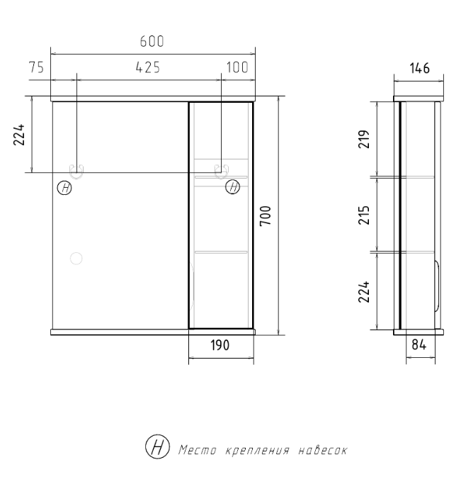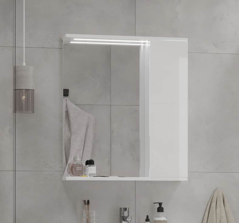 Зеркало-шкаф с двумя стеклянными полками за распашной дверцей. Петли оснащены доводчиками. Фасад зеркального шкафа изготовлена из МДФ и облицована глянцевой пленкой ПВХ. Зеркало-шкаф оснащено встроенной светодиодной подсветкой, электрической розеткой и выключателем. Шкафчик открывается при помощи интегрированной ручки.