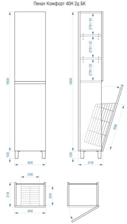 - Функционал: 2 дверцы и бельевая корзина, 3 полки
