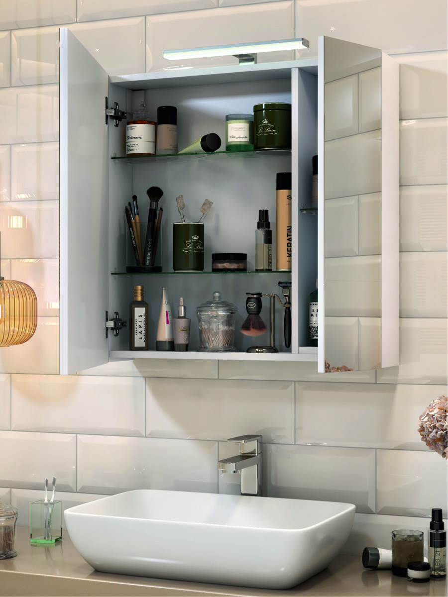 4 стеклянных полки, 2 дверцы, 1 светодиодный светильник, включатель с розеткой (мощность 2,3 квт) |