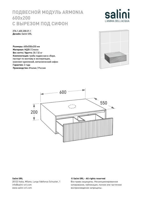 - Комплектация: Тумба подвесная в сборе; паспорт по монтажу и эксплуатации; комплект креплени, металлический сифон