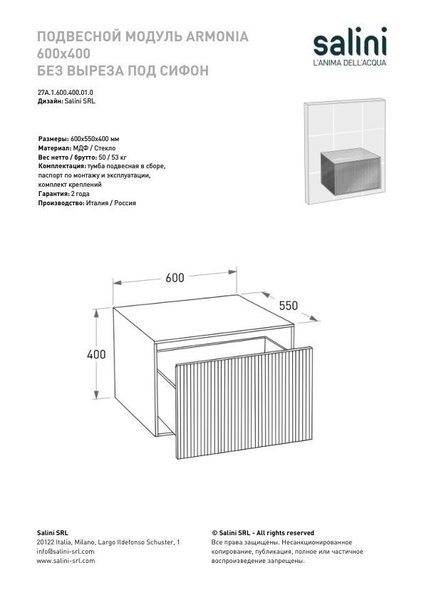 Тумба подвесная в сборе; паспорт, комплект креплений |