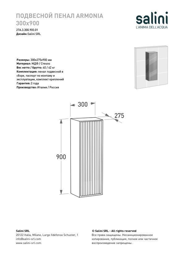 - Комплектация: Пенал подвесной в сборе ; паспорт, комплект креплений
