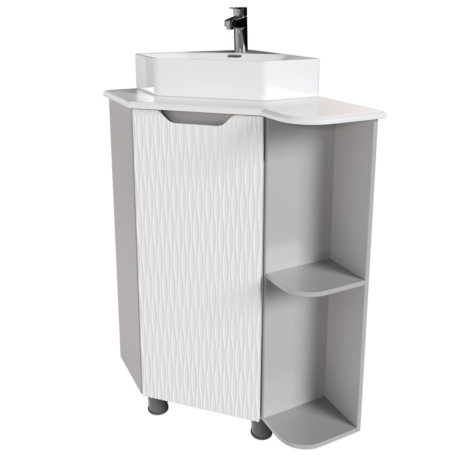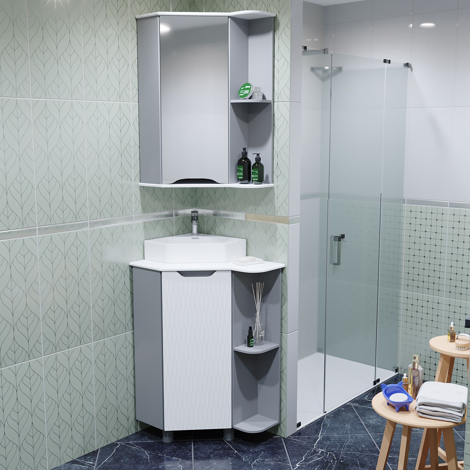 Коллекция угловой мебели для ванной представлена в трех классических цветовых решениях: сером, белом и дуб.
