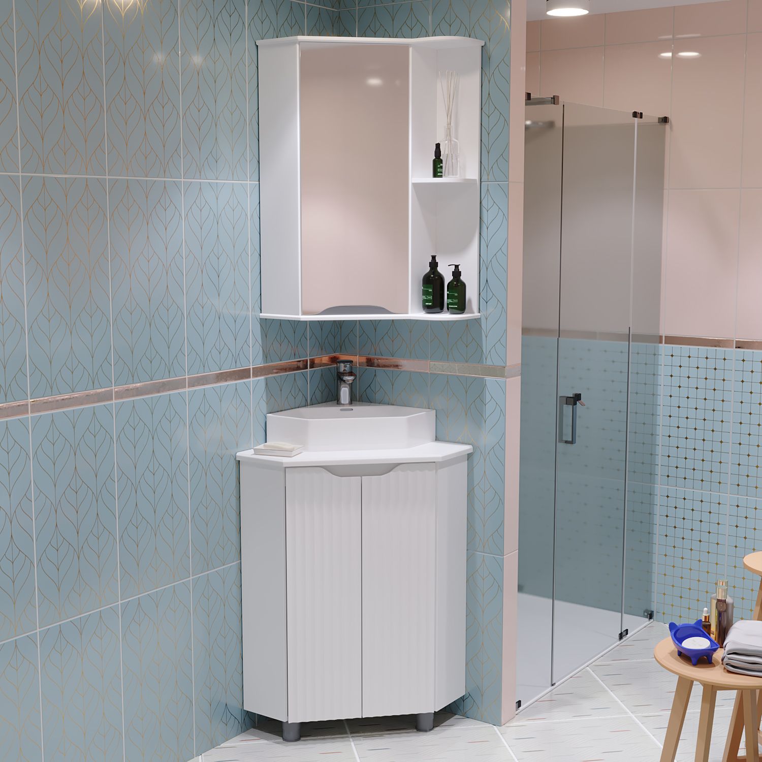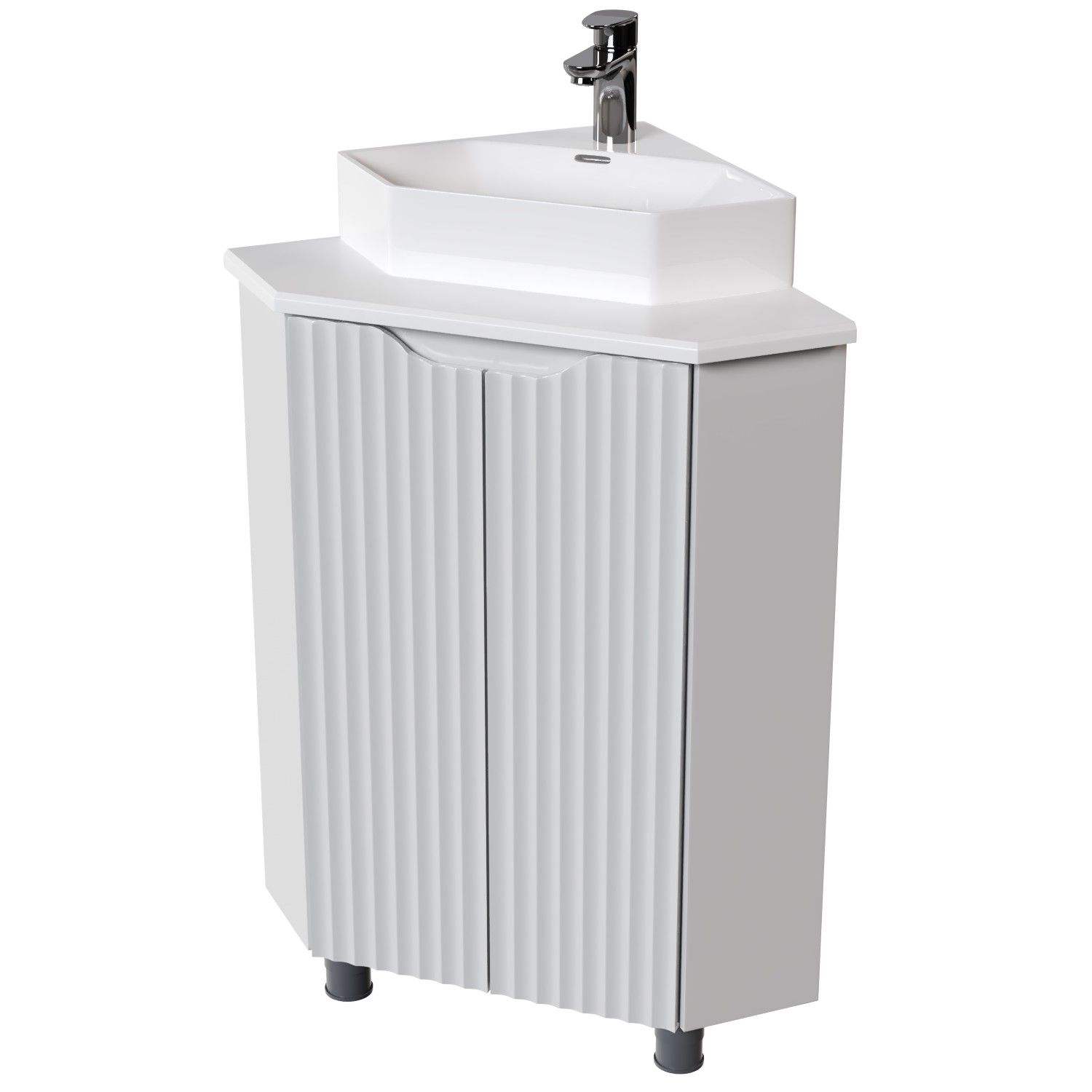 Коллекция угловой мебели для ванной представлена в трех классических цветовых решениях: сером, белом и дуб.
