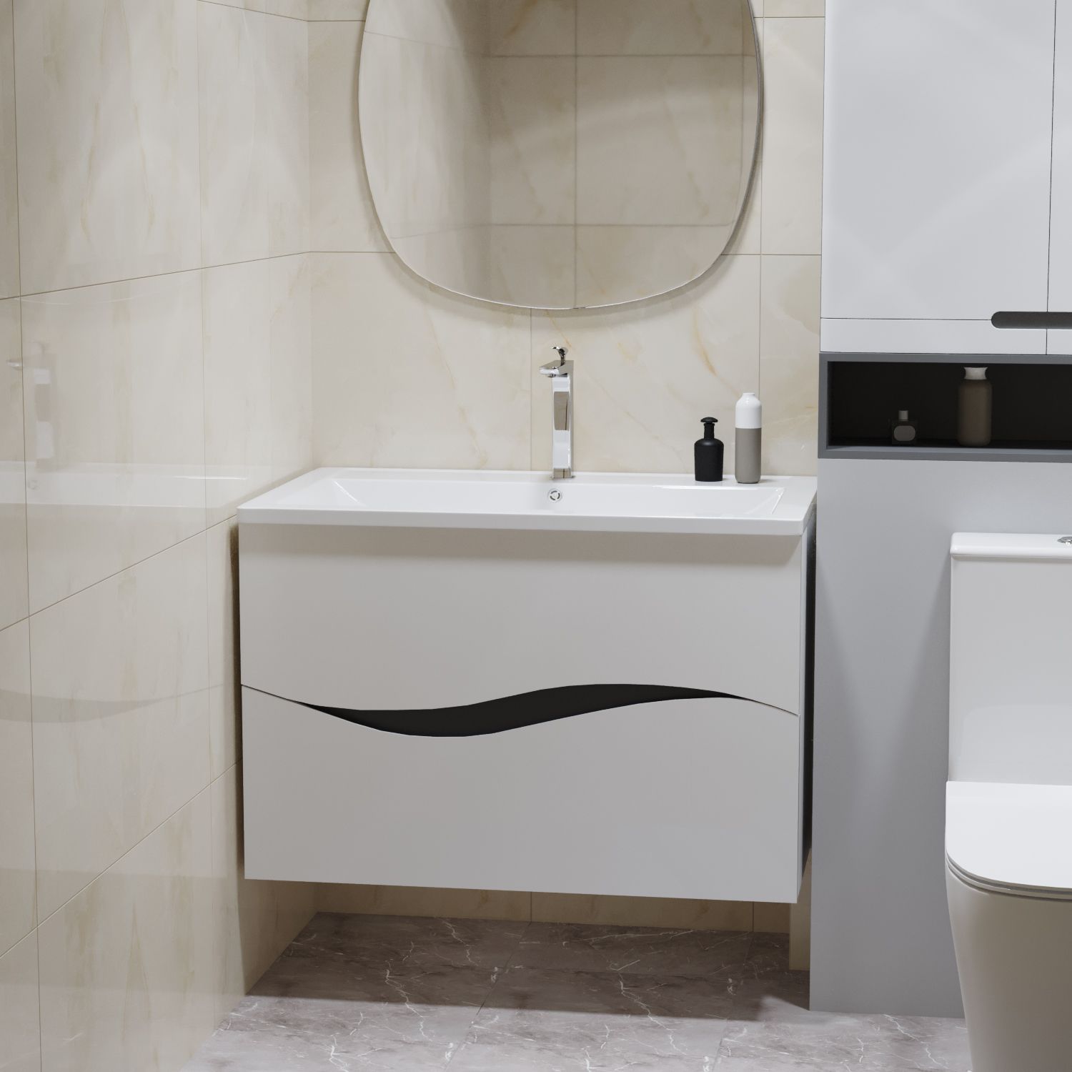 Мебель - влагостойкая, не боится частого попадания воды, что важно в условиях ванной комнаты. Она прослужит долго и надежно, не теряя своей привлекательности.