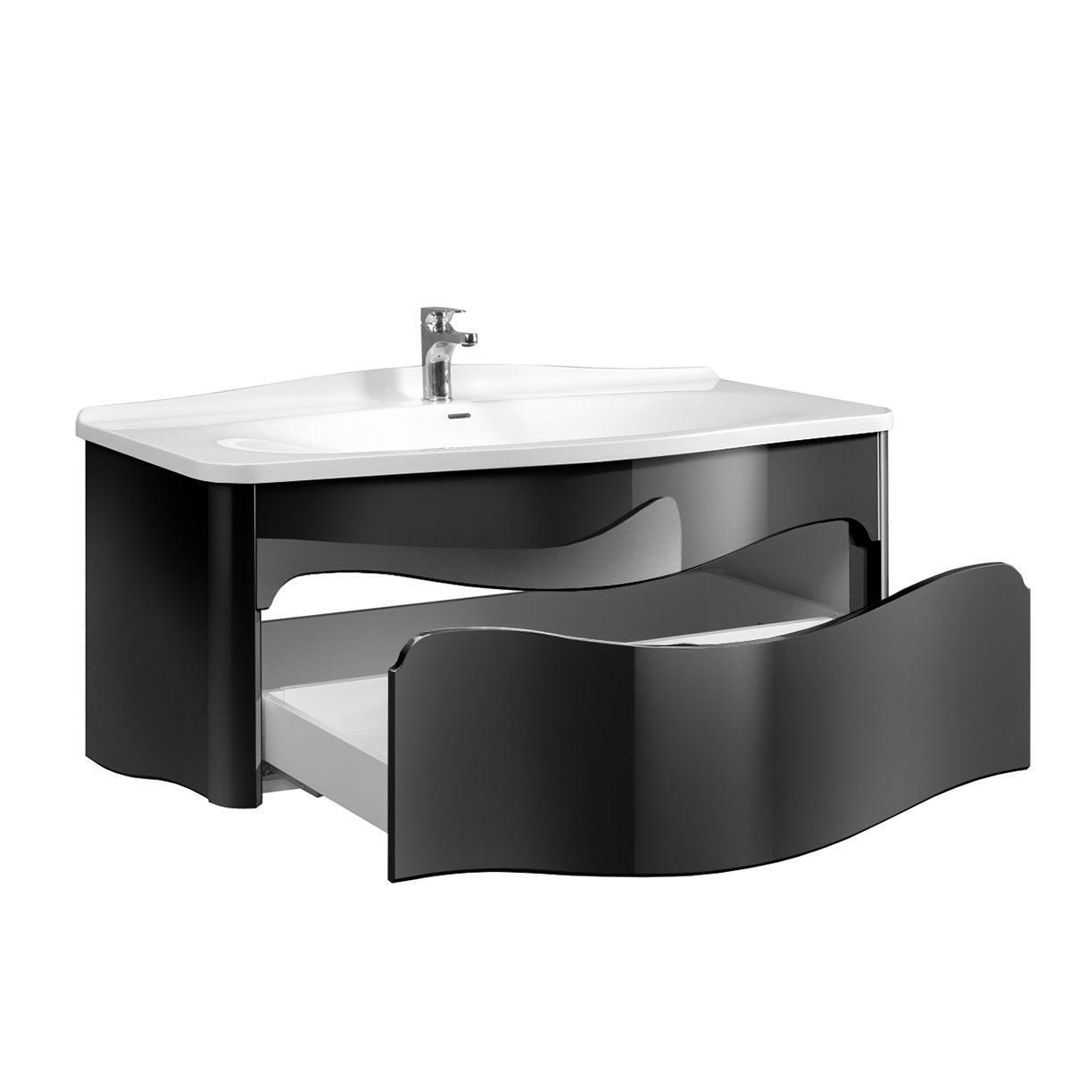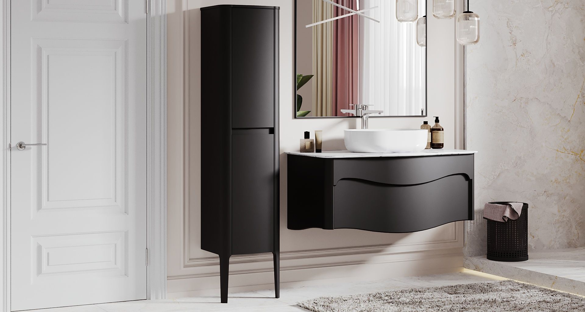 Гнутые фасады тумбы повторяют изгибы раковины Анжело. Это не только комфортно, но и нетривиально, а также удивительно красиво.
