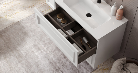 - Особенности: фасад ящика фрезерованный с декоративной вставкой и с интегрированной ручкой