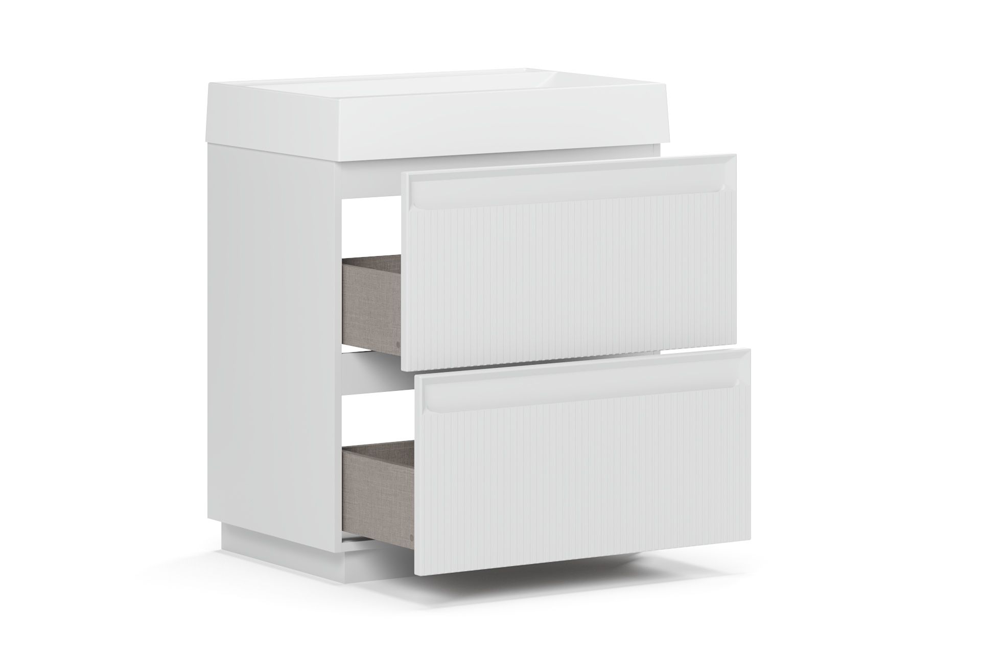Изюминка коллекции - фасады. Вертикальные линии создают элегантность и подчеркивают уникальность мебели. Интегрированная ручка на фасаде не только придает тумбе эстетическое преимущество, но и обеспечивает комфортное открывание и закрывание ящиков, а также добавляет легкости и воздушности.