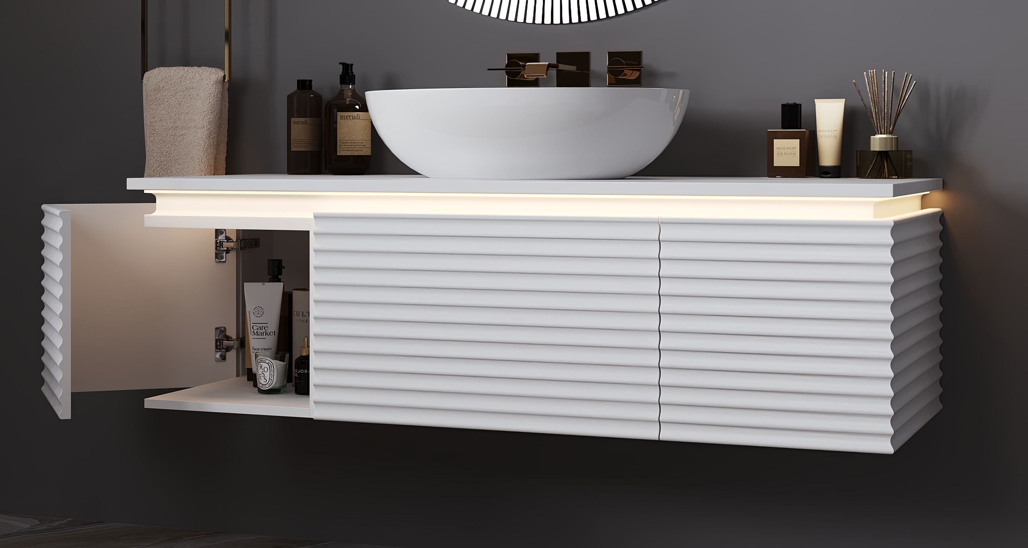 Сенсорная подсветка в тумбах коллекции Дубай подчеркивает изящный фасад изделий со всех сторон, а также обеспечивает функциональность и эстетику.